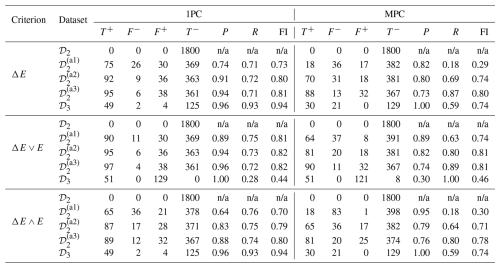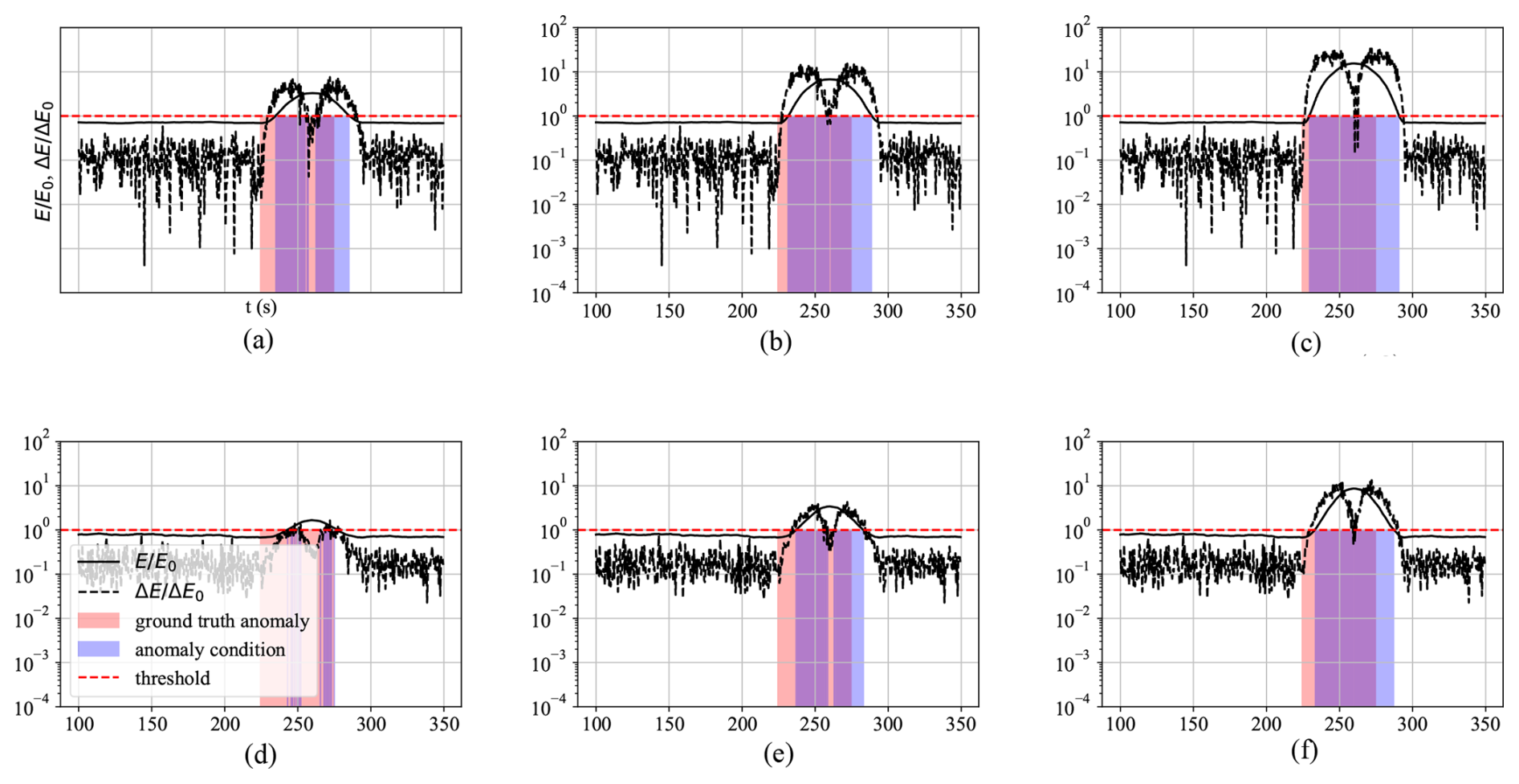 Model ℳ1 was tested on the synthetically altered variations of 𝒟2 – datasets , , and – using both 1PC and MPC variations. The results are presented in Fig. 11, where the first row (Fig. 11a–c) shows the 1PC model responses, and the second row (Fig. 11d–f) presents the MPC model responses. The anomaly criterion selected for this analysis is the joint condition (ΔE∧E).