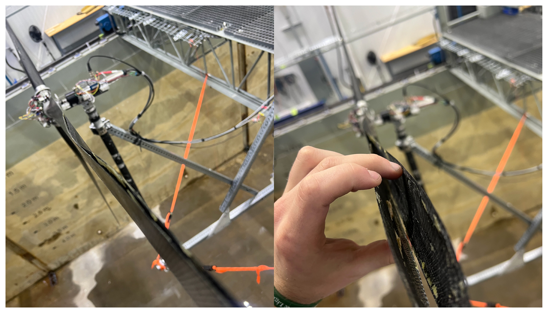 During a high-rotor-angular-velocity test, 𝒟3, an unexpected anomaly caused the rotor to accelerate rapidly. The resulting increase in thrust forces caused significant blade deflection, and within 4 s, one of the blades struck the tower, leading to severe damage, as shown in Fig. 13.