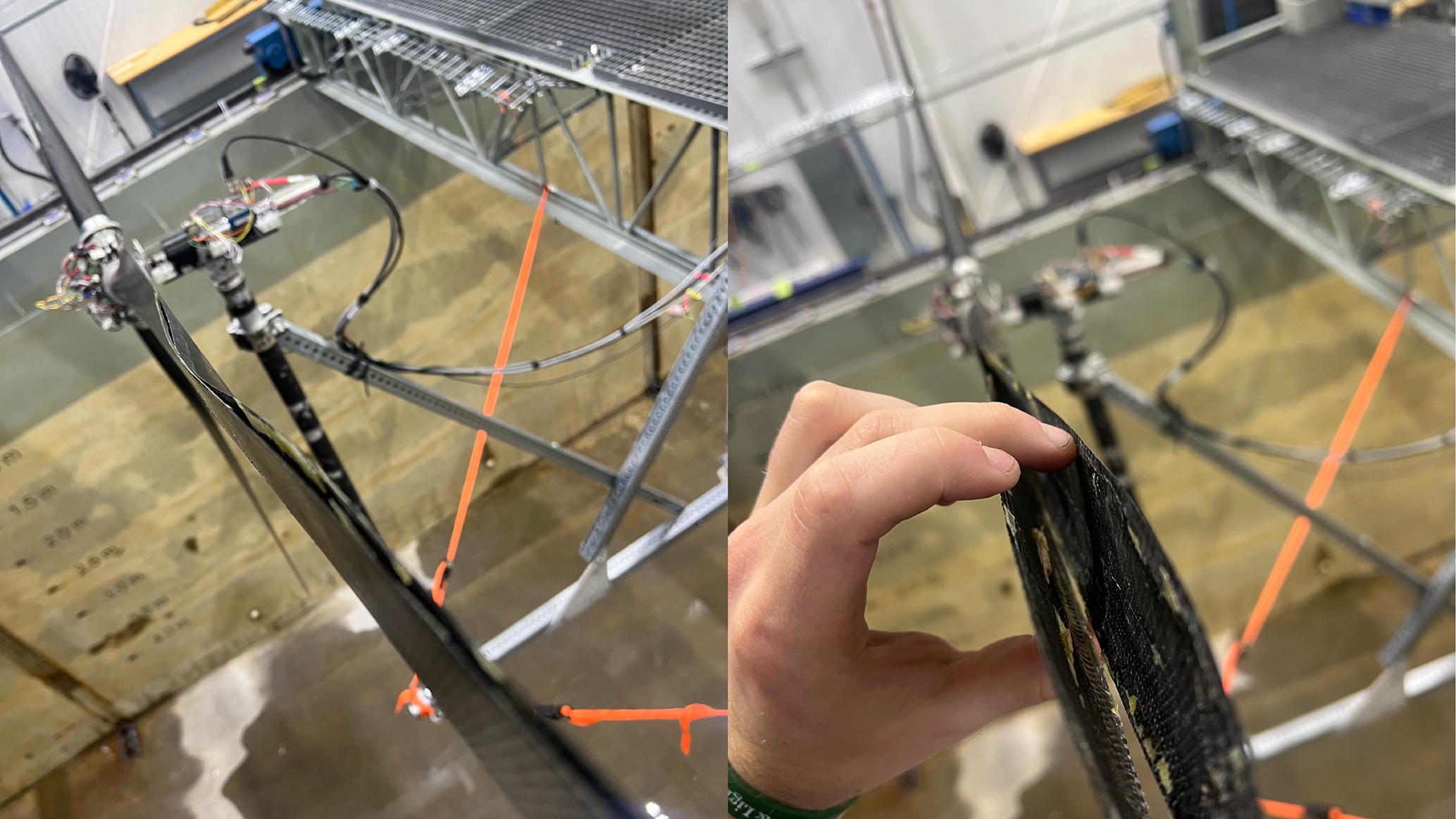To meet this demand, lab-scale turbine systems are designed to match the performance of full-scale offshore commercial wind plants, enabling accurate coupling between wind turbine aerodynamics and the hydrodynamic forces on the substructure (Fowler et al., 2023; Kimball et al., 2014; Cao et al., 2023). Due to the low Reynolds number at lab scale, thin airfoil sections are used for the model turbine blades, such as the SD7032, to achieve full-scale rotor performance. However, this increases blade flexibility and reduces structural strength. Additionally, because of strict mass constraints – particularly for floating configurations – system redundancy that accommodates equipment malfunctions is typically not included in the design (Parker, 2022). As a result, lab-scale turbines are highly sensitive systems that require careful handling by operators to ensure safe and reliable operation throughout a test campaign.