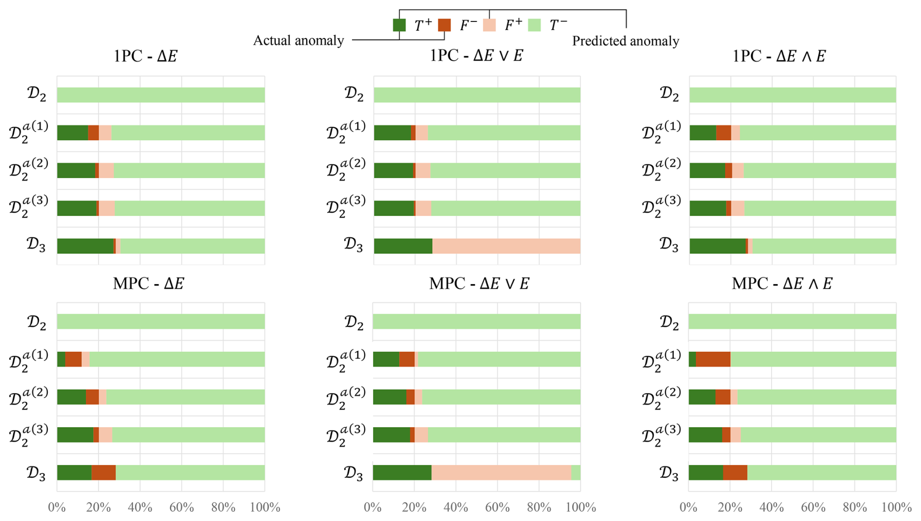 Figure 15 presents the relative percentages of true positives, false negatives, false positives, and true negatives for model ℳ1 across the same set of testing datasets. In the horizontal bar charts, darker shades correspond to the presence of anomalies in the data – hence their absence in the healthy dataset 𝒟2. The sign of each classification outcome indicates whether the model successfully detected an anomaly (positive) or failed to do so (negative). Color is used to convey prediction quality and context: green denotes correct classifications, while red indicates incorrect ones. This visual encoding effectively communicates both the correctness of model predictions and the operational context in which they occur, thereby emphasizing the model’s ability to distinguish between healthy and anomalous system states.