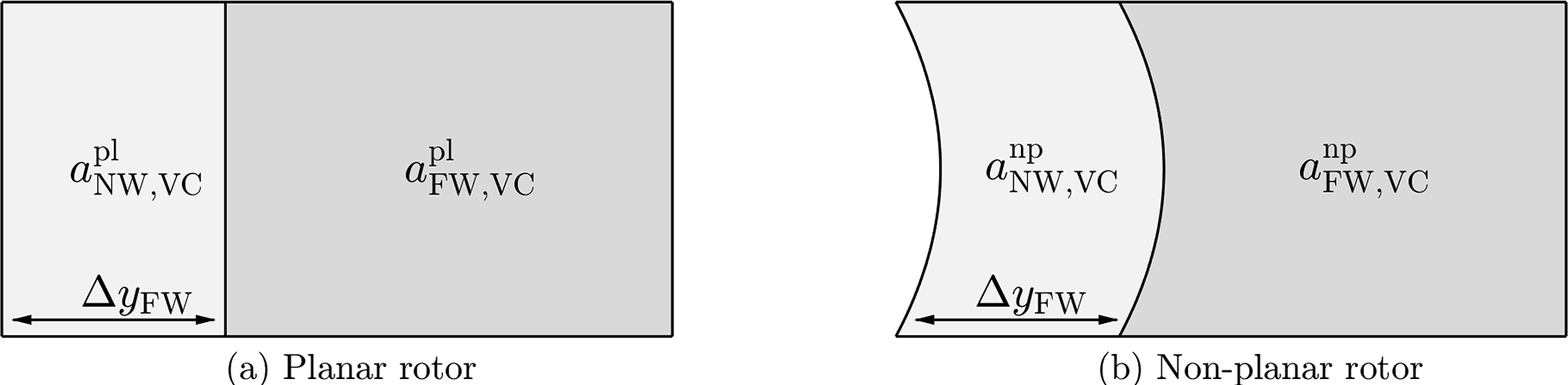 Figure 2Decomposition of the full trailed-wake vortex cylinder into a near-wake part and a far-wake part for (a) a planar rotor and (b) a non-planar rotor. All far-wake vortex cylinders begin at a constant distance of ΔyFW further downstream from the rotor plane, which is the surface swept by the blades.