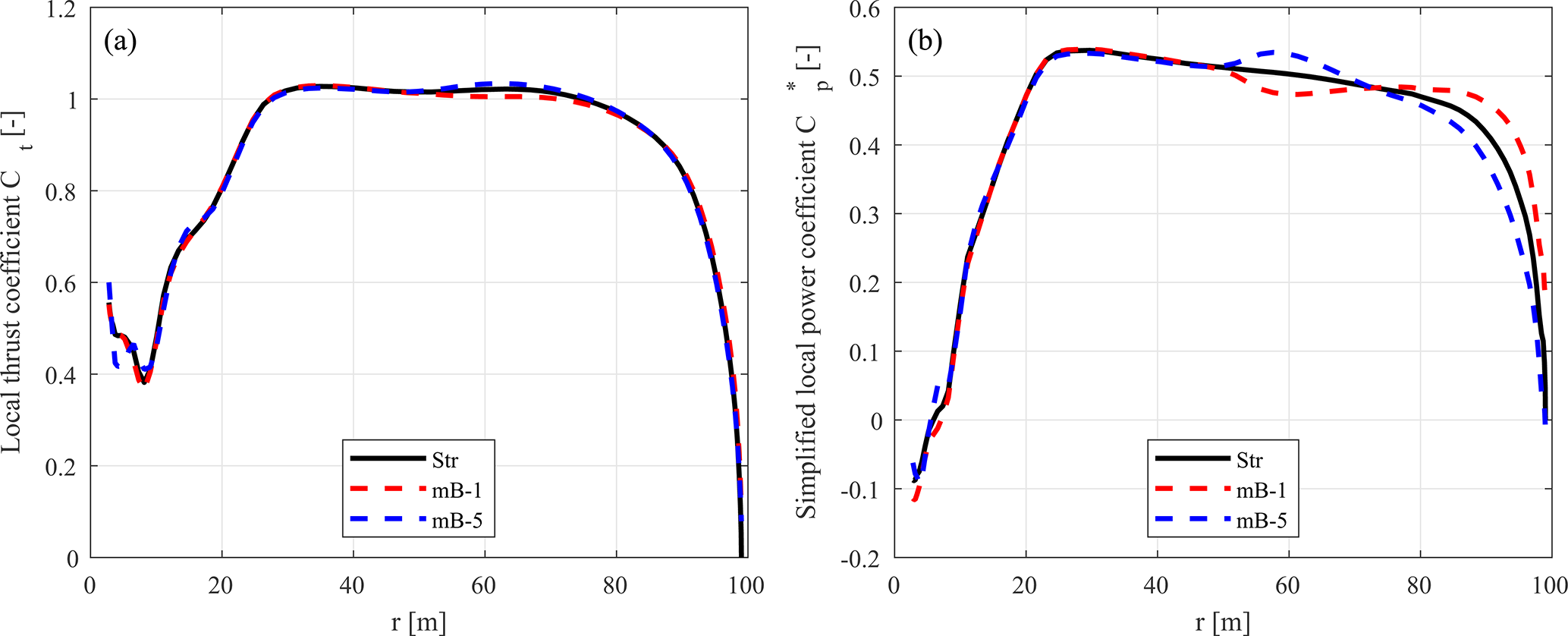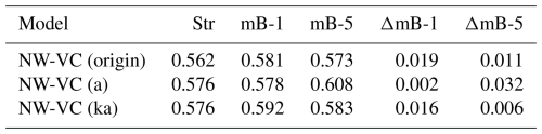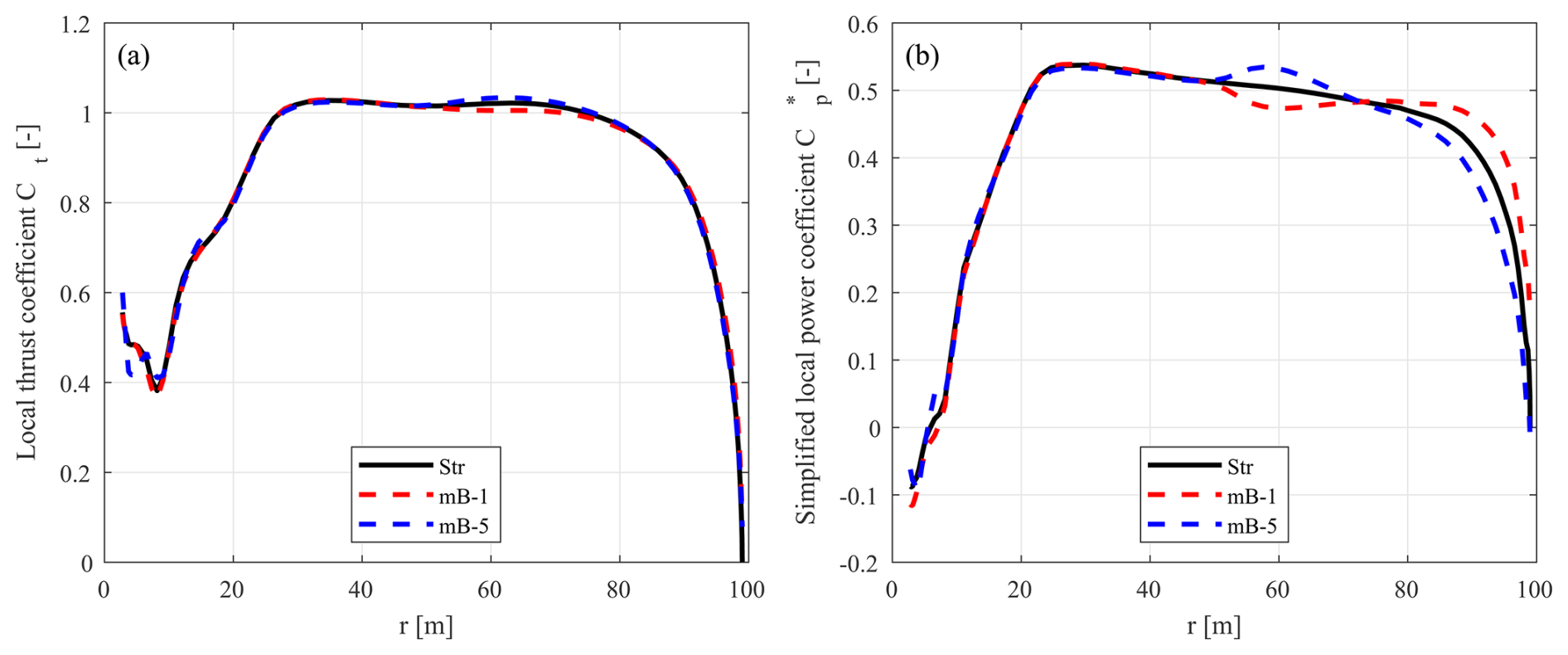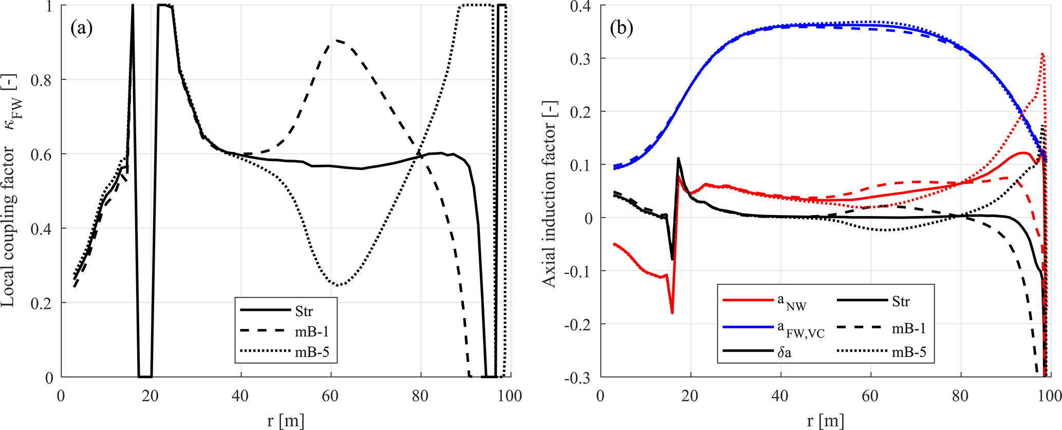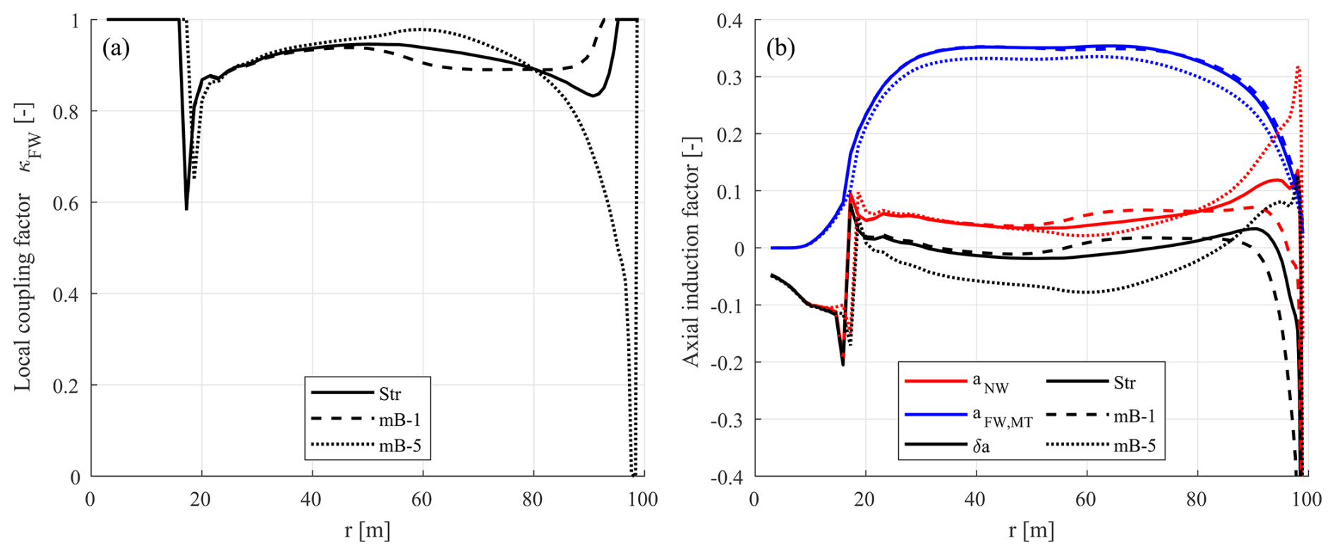 Previous work (Li et al., 2022d) demonstrated that the existing automatically adjusted coupling factor in the coupled NW-MT model performs well for straight and backward-swept blades but exhibits unsatisfactory performance for forward-swept blades. Although the primary source of the issue was narrowed down to the coupling factor, the underlying causes were not analysed in depth. This section provides a detailed examination of the current coupling factor to identify the reasons for its insufficient performance. Modifications are then proposed to address these issues, aiming to enable a more robust, automatically adjusted coupling factor for general swept blades. Improving the coupling factor will enhance the accuracy and reliability of aerodynamic load predictions for swept blades, which is critical for blade design optimizations. Because coupling factors are calculated very similarly for both the far-wake momentum theory () and the far-wake vortex cylinder model (), NW-MT is used for this investigation3. The blades used for the investigation are the baseline straight blade (Str), the backward-swept blade (mB-1), and the forward-swept blade (mB-5), as described in Sect. 7.3.