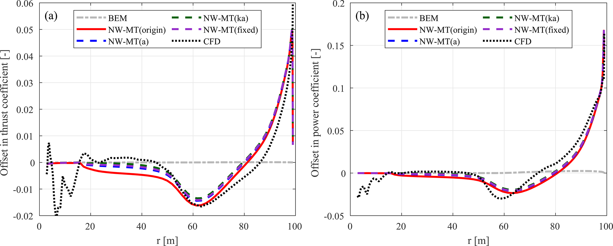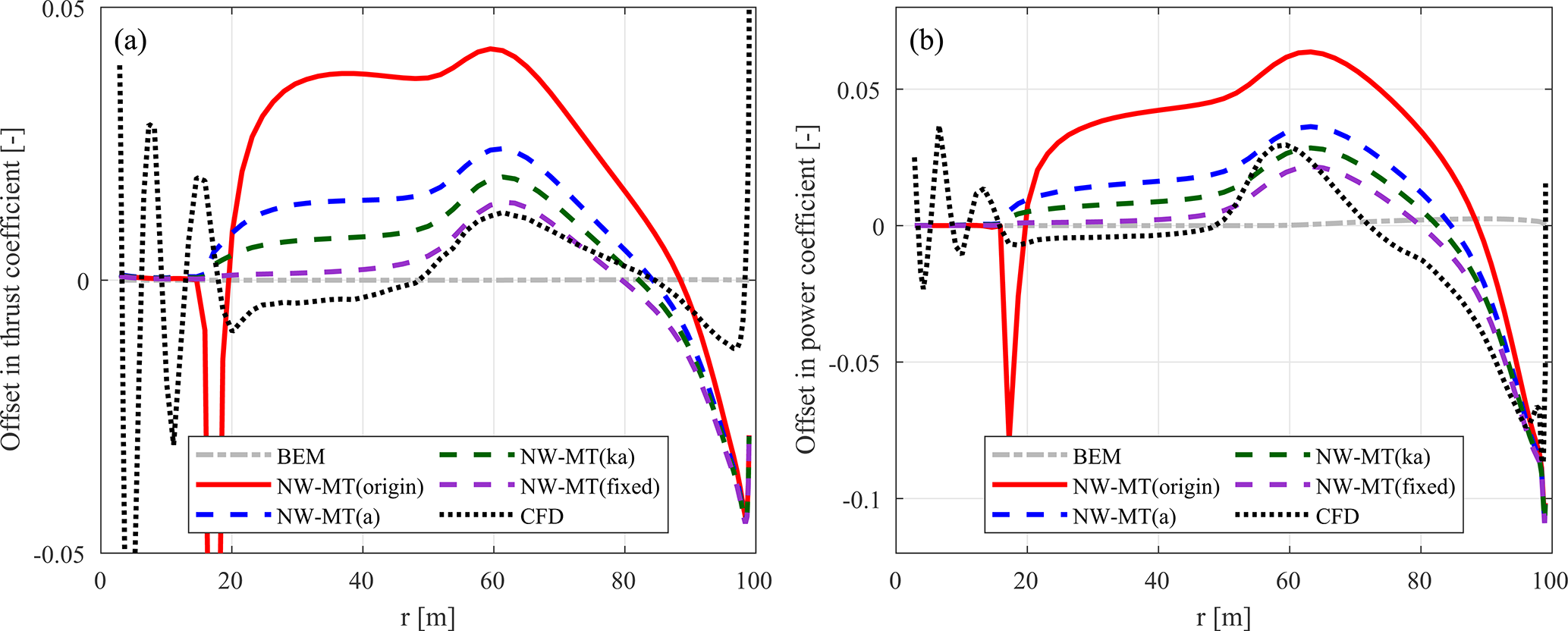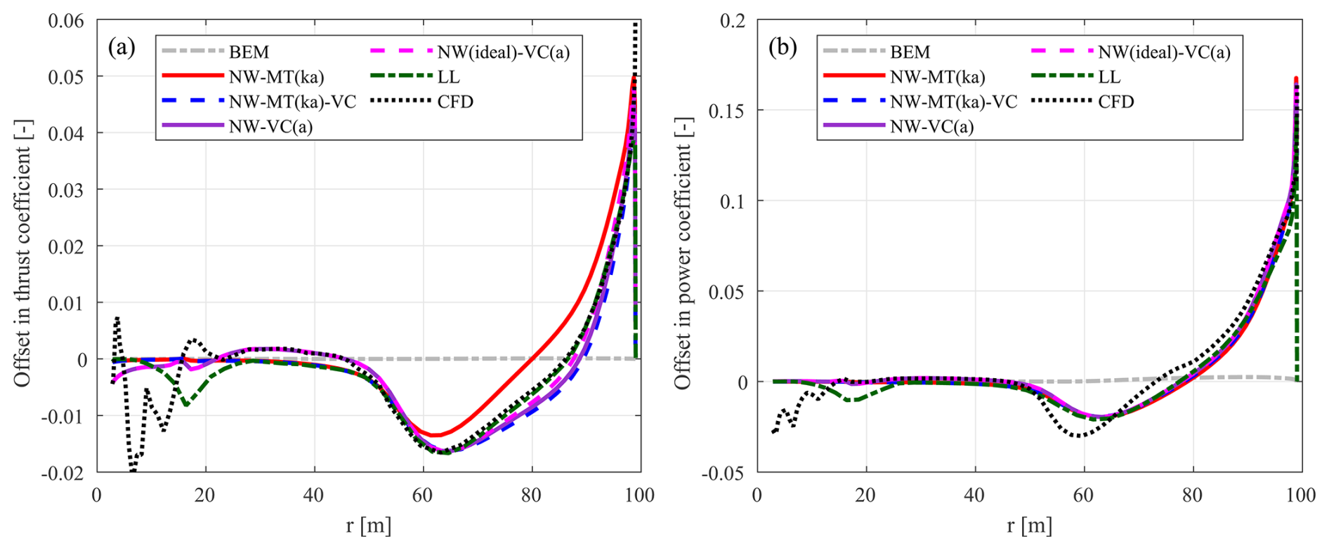 Table 1Comparison between different coupled models, in ascending order of fidelity. The modelling of axial, tangential, and radial induction components are compared. NW-MT represents the previous implementation. NW-MT-VC extends this by including radial induction from the vortex cylinder (VC) model. NW-VC further improves the far-wake modelling and is the primary model. Finally, NW (ideal)-VC serves as an idealized reference model.