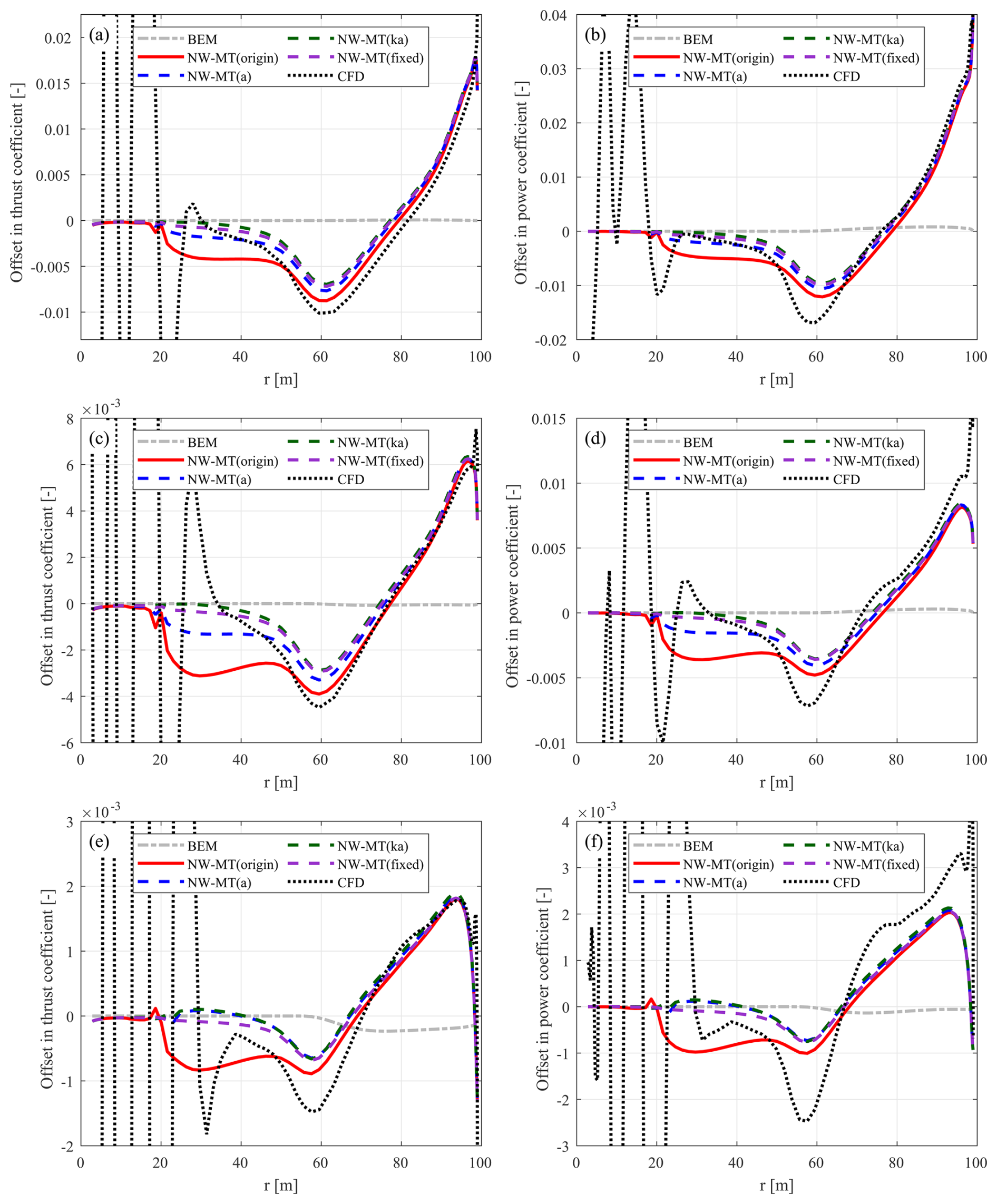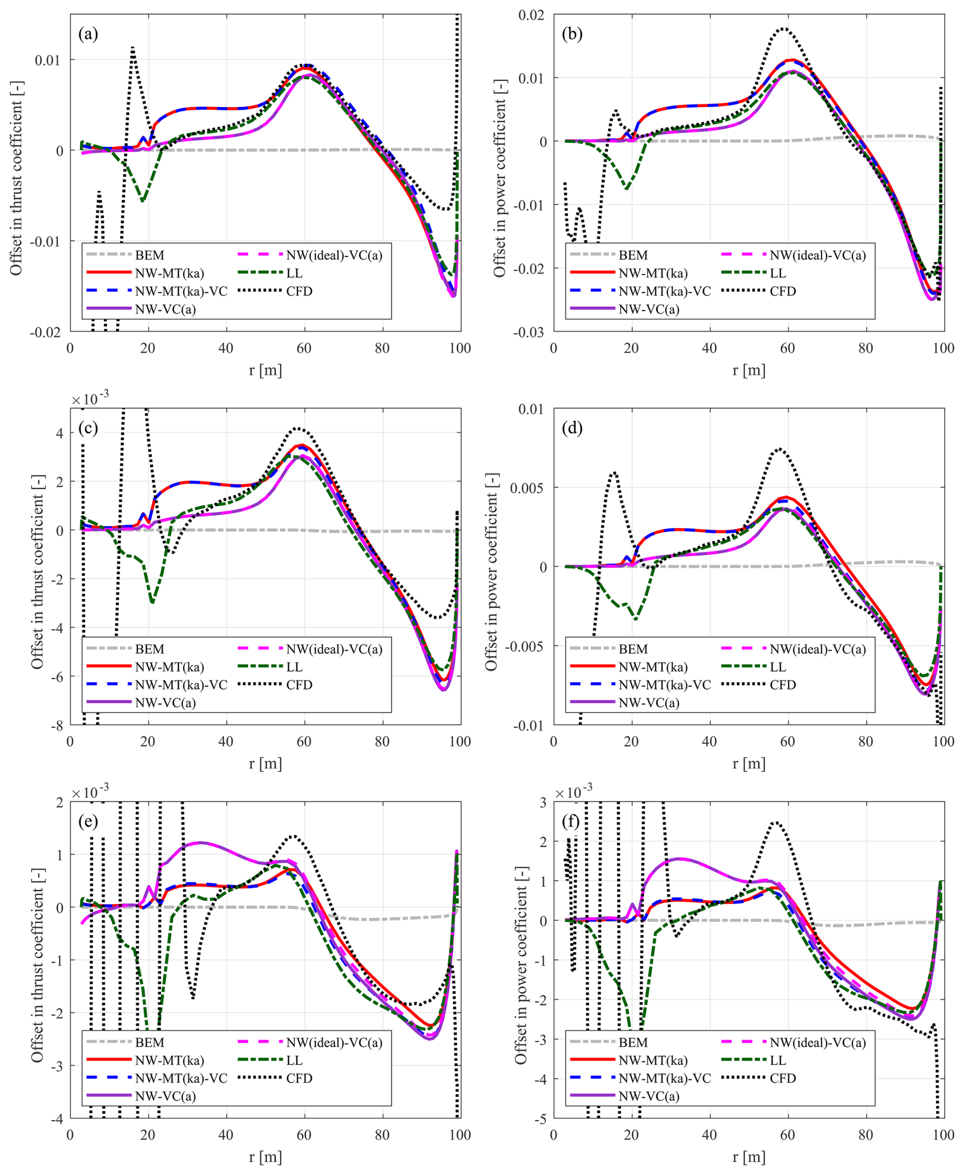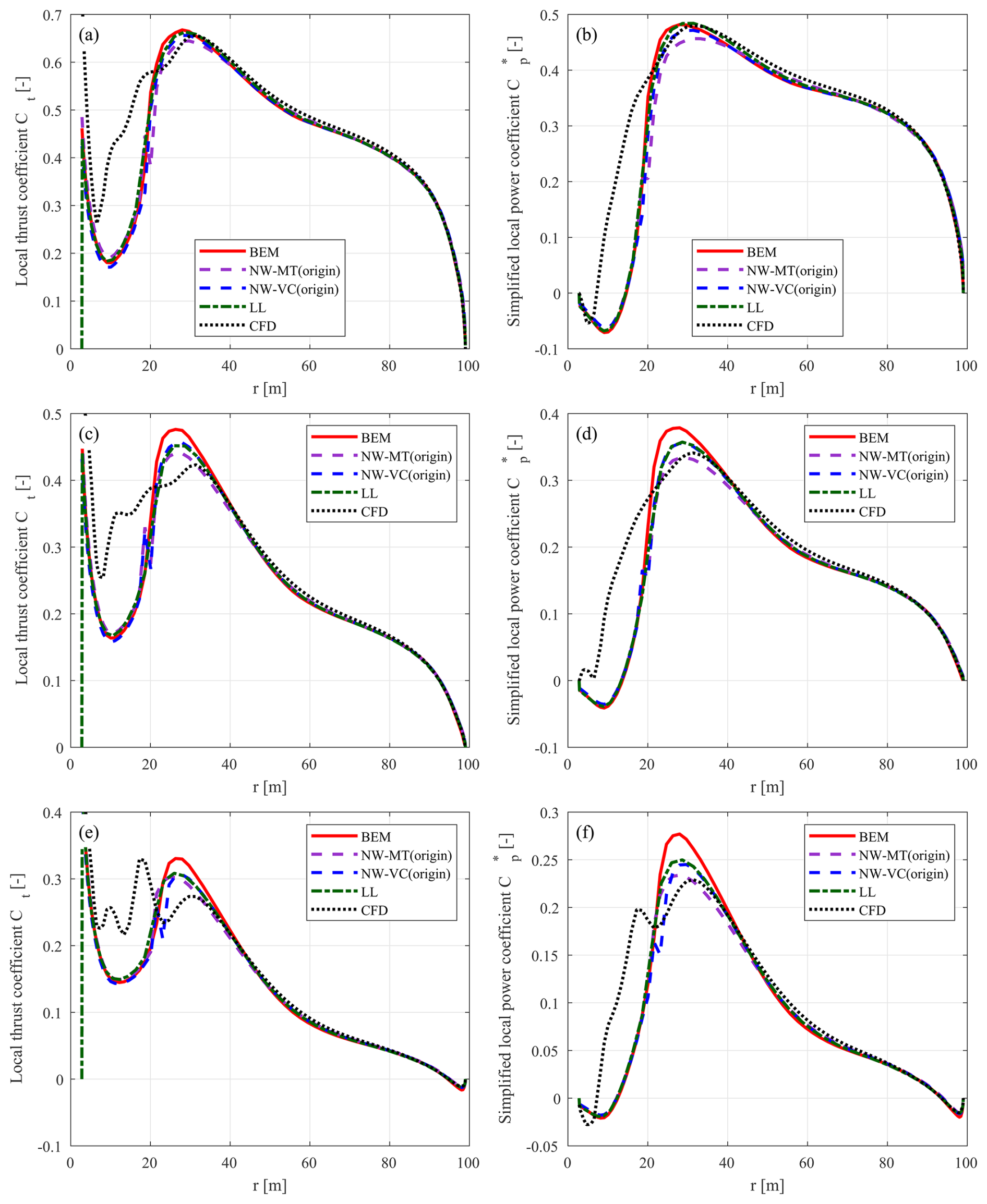 Figure C1Thrust coefficient Ct and simplified power coefficient of the baseline straight blade. Values are calculated using the BEM method, the coupled methods NW-MT and NW-VC with the original coupling factor, the LL solver, and the CFD solver. Results are shown for three operational conditions: (a, b) at 12 m s−1, (c, d) at 15 m s−1, and (e, f) at 20 m s−1.