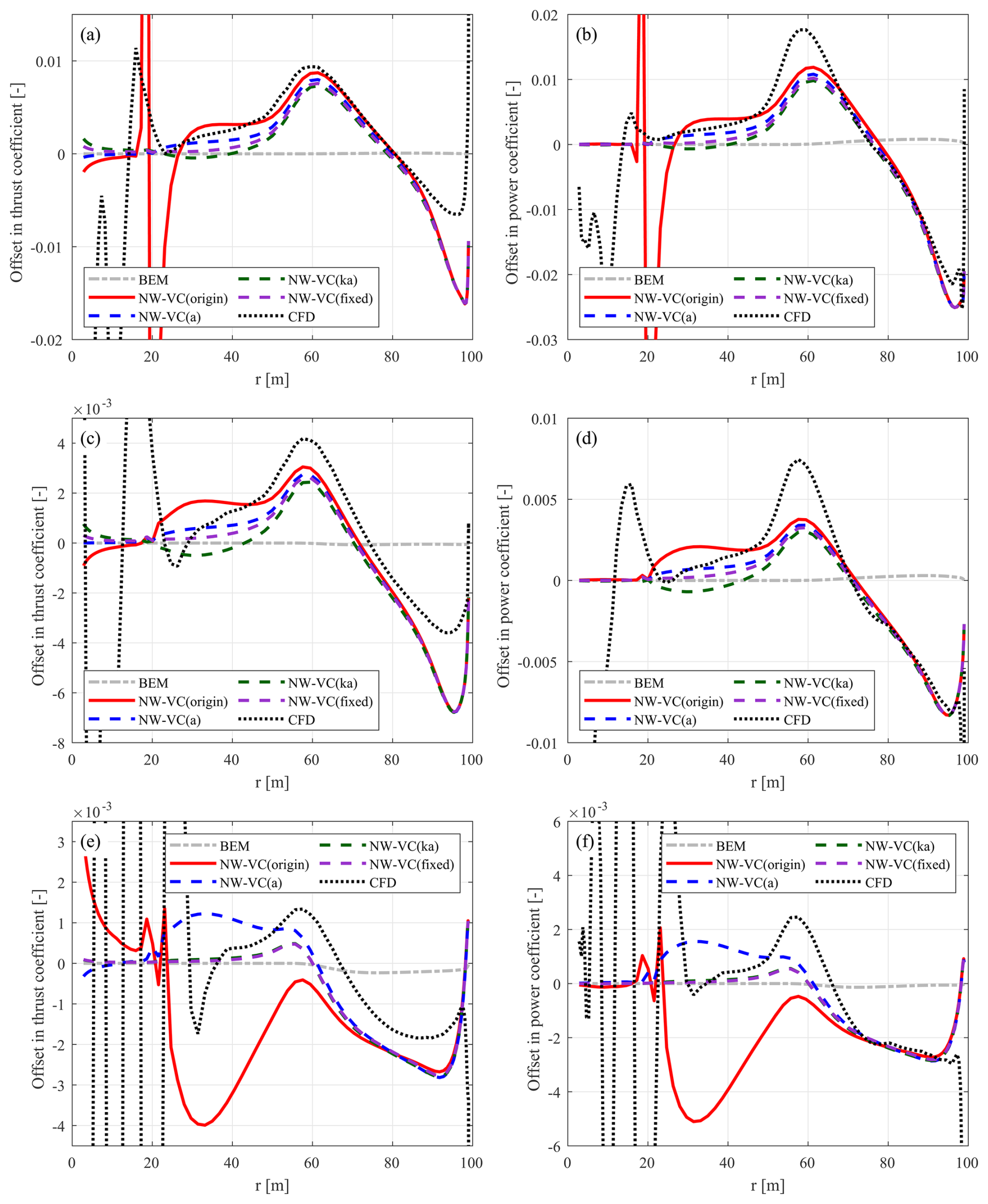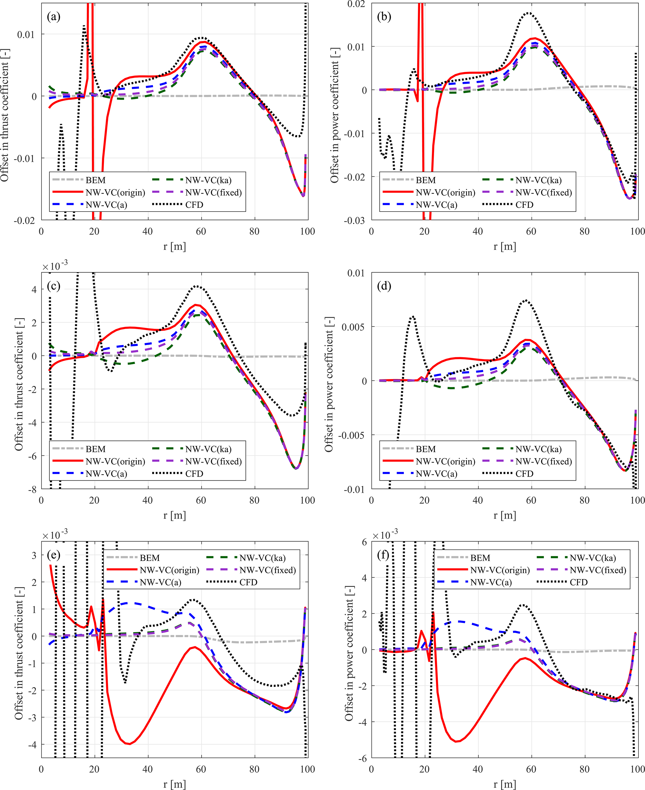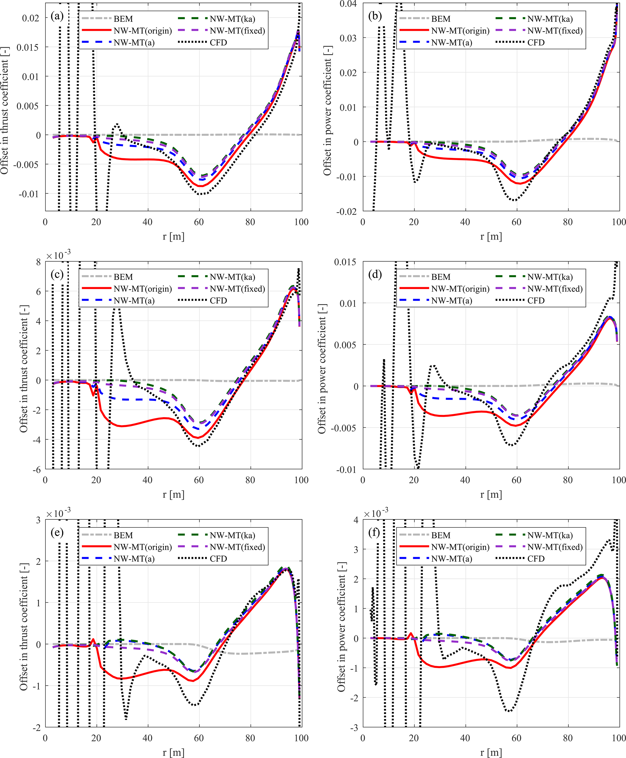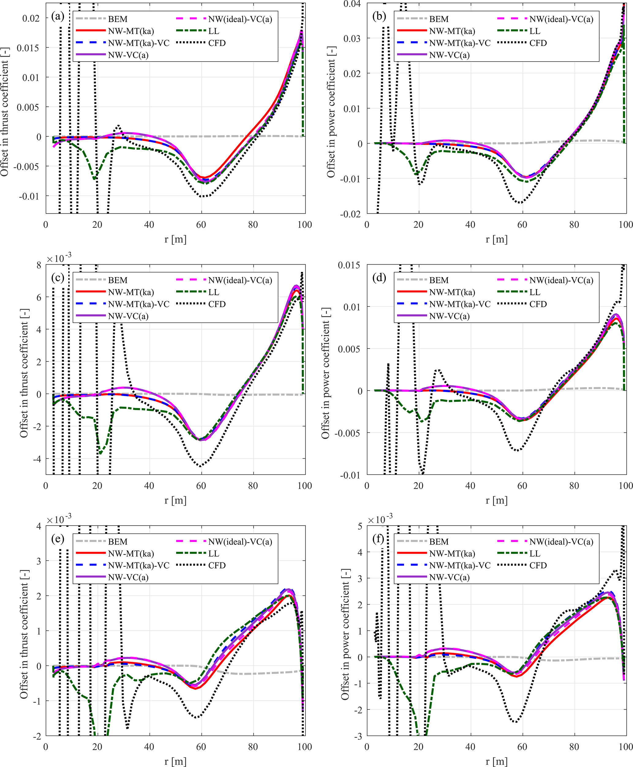 Figure C1Thrust coefficient Ct and simplified power coefficient of the baseline straight blade. Values are calculated using the BEM method, the coupled methods NW-MT and NW-VC with the original coupling factor, the LL solver, and the CFD solver. Results are shown for three operational conditions: (a, b) at 12 m s−1, (c, d) at 15 m s−1, and (e, f) at 20 m s−1.