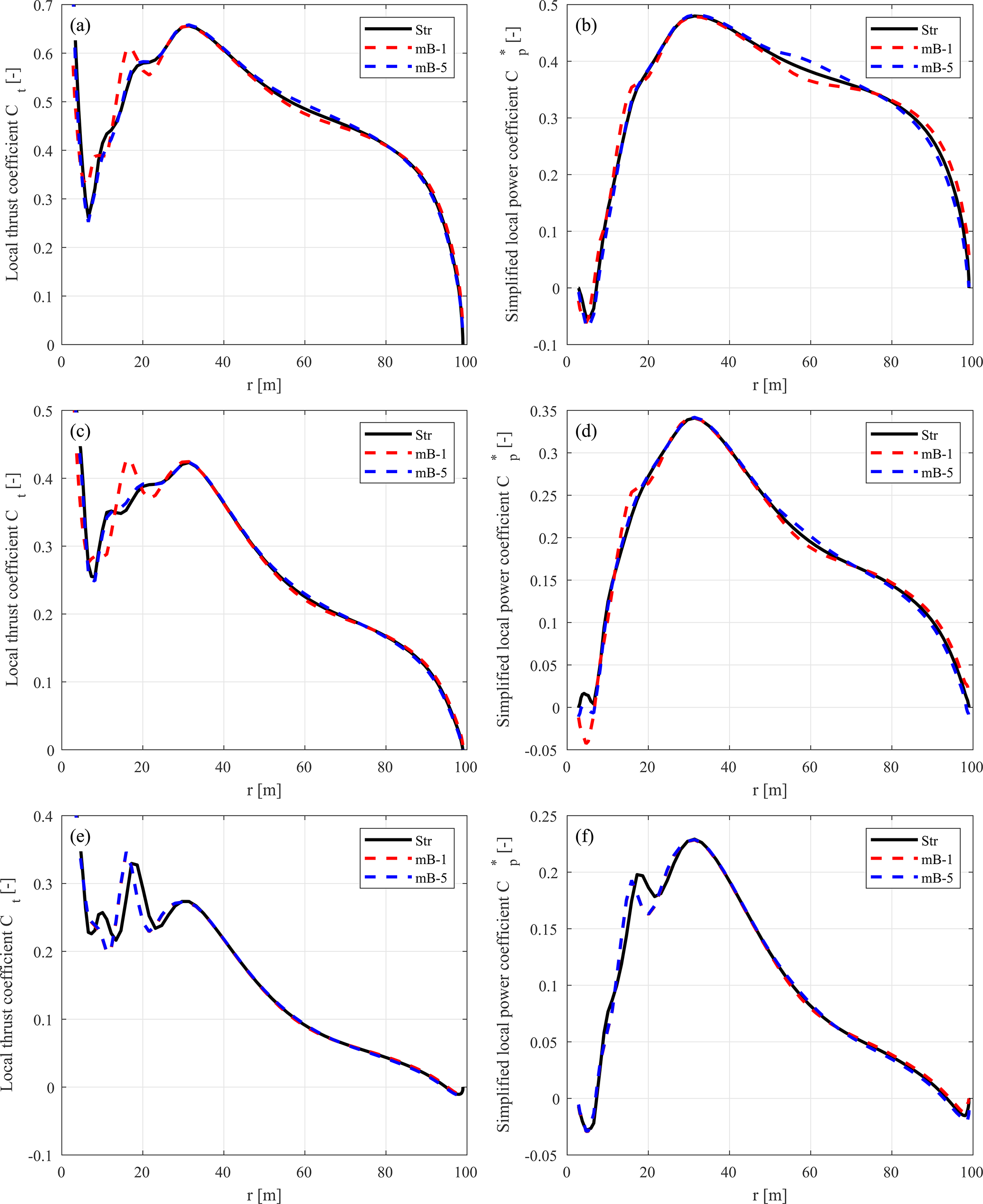 Figure C8Offset in thrust coefficient (ΔCt) and simplified power coefficient of the forward-swept blade mB-5 compared to the baseline straight blade Str. Values are calculated using different coupled models, the BEM method, the LL solver, and the CFD solver. Results are shown for three operational conditions: (a, b) at 12 m s−1, (c, d) at 15 m s−1, and (e, f) at 20 m s−1.