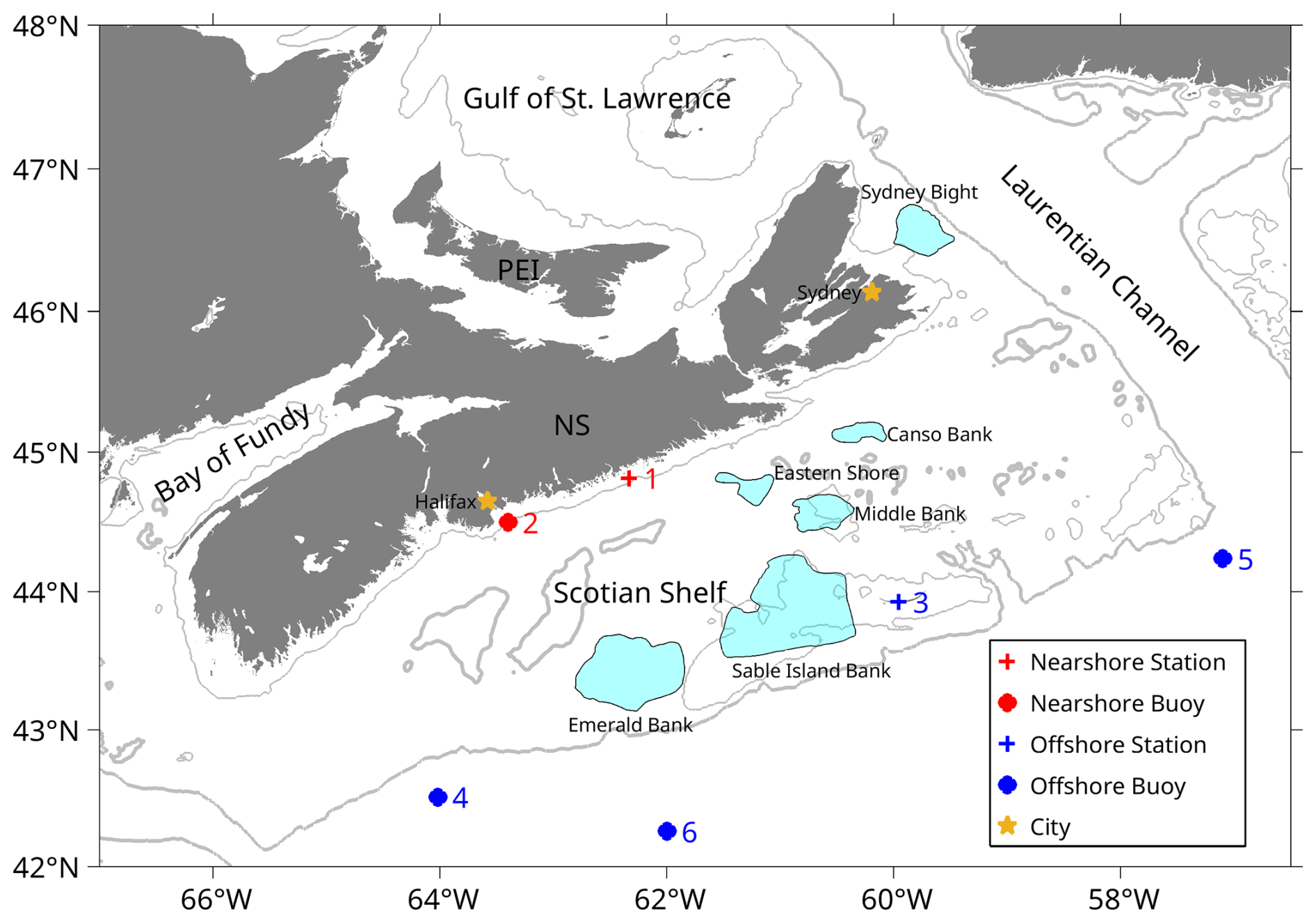 Offshore wind farms have rapidly developed globally over the past decade (World Forum Offshore Wind, 2024), driven in part by the greater consistency and abundance of wind resources compared to onshore wind farms. By the end of 2023, the capacity in operation of global offshore wind farms had reached 67.4 GW and is projected to reach 414 GW by 2032, which is a significant increase from 7.9 GW in 2014 (World Forum Offshore Wind, 2024). Although no wind turbines have been installed in Canadian offshore waters to date, offshore wind is expected to play a key role in Canada's electricity portfolio in support of the country’s net-zero emissions goal by 2050 (Canada Energy Regulator, 2023). Nova Scotia’s offshore waters rank among the world's best wind resources, with average wind speeds of 9–11 m s−1 at 100 m above the ocean surface (Aegir Insights ApS, 2023; Nicholson, 2023). The federal and provincial governments plan to offer leases for 5 GW of offshore wind development on the Scotian Shelf by 2030 (Government of Nova Scotia, 2023).