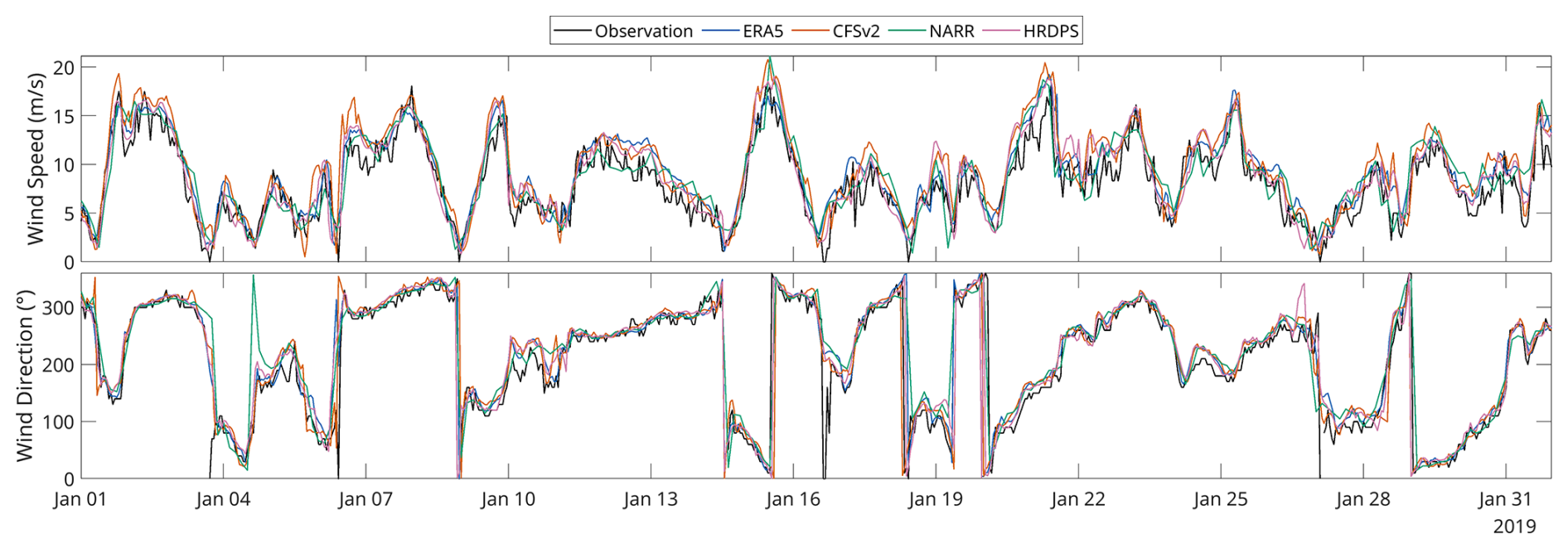 Figure 3Time series of wind speed (upper panel) and wind direction (lower panel) at Site 3 at a 10 m height above the surface for observation and the four wind datasets: ERA5, CFSv2, NARR, and HRDPS. The comparison was for the month of January 2019.