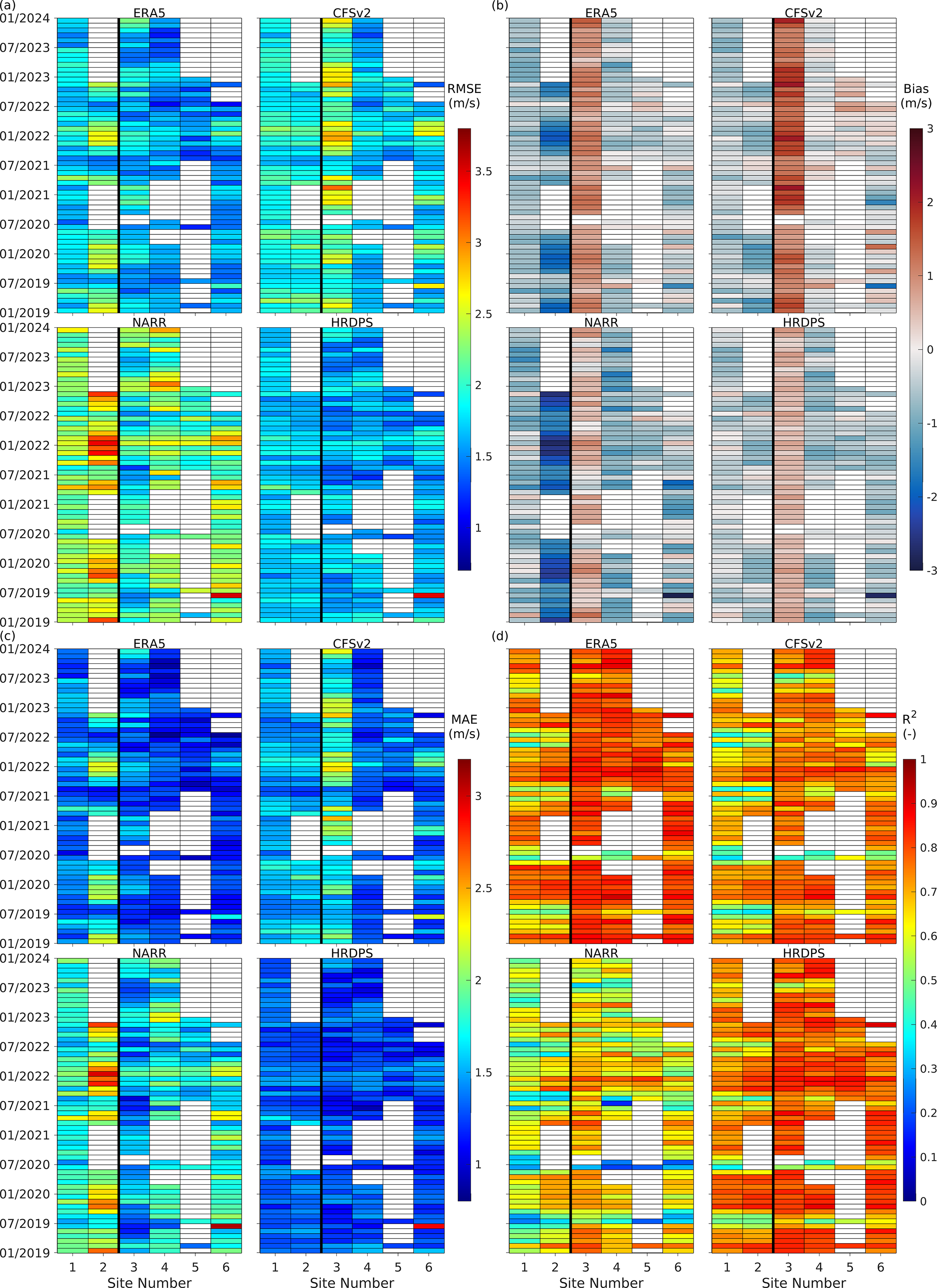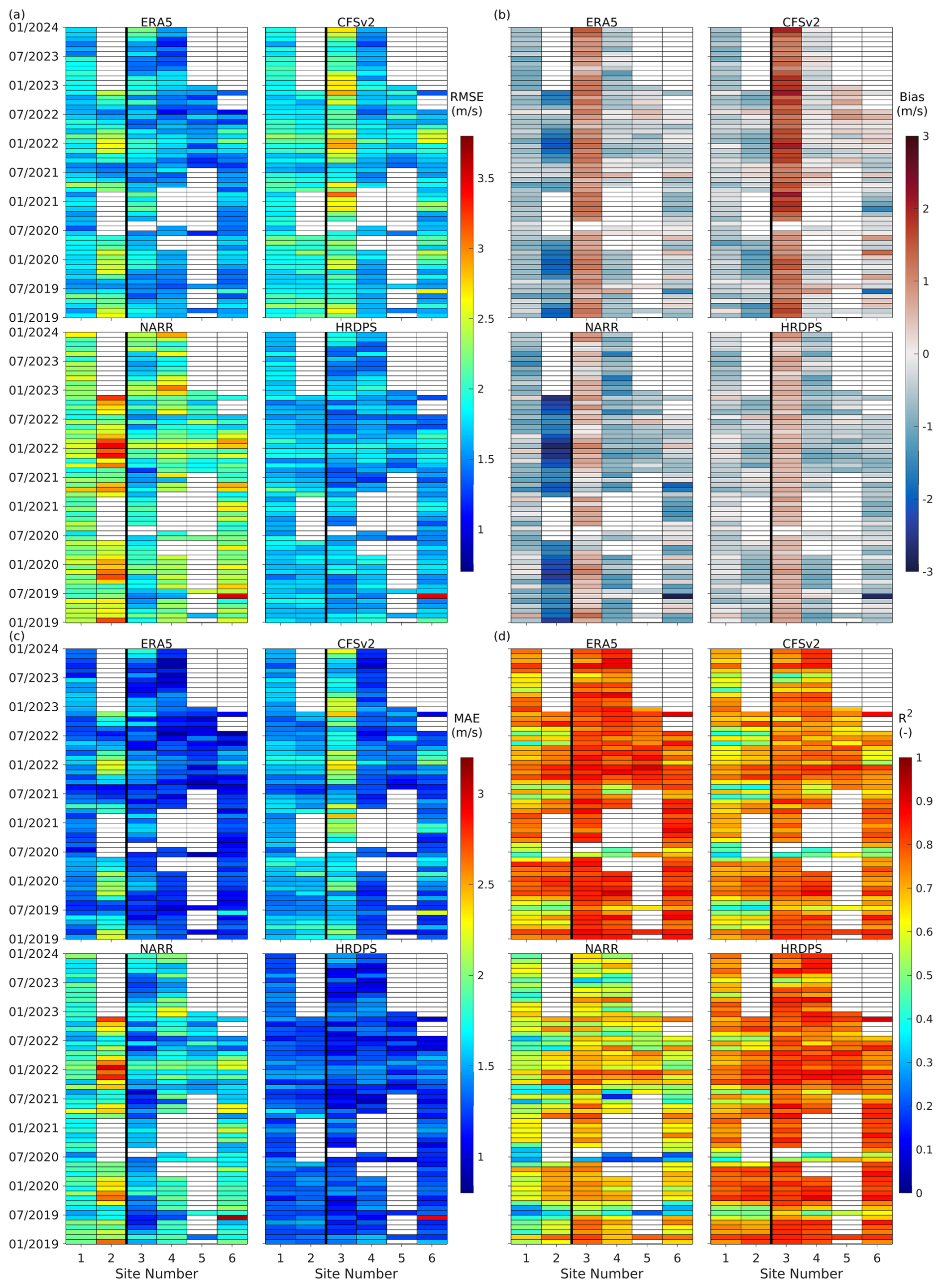 Figure 4Pseudocolour plots displaying monthly (a) RMSE, (b) bias, (c) MAE, and (d) R2 for wind speed for each dataset per wind observation site from 1 January 2019 to 31 December 2023. Sites 1 and 2 are representative of the nearshore (left of the bold black line in each subplot) and Sites 3–6 are representative of the offshore (right of the bold black line in each subplot) on the Scotian Shelf. The wind dataset is indicated at the top of each subplot. Blank areas (white pixels) indicate months and sites that had insufficient valid observation records (considered to be less than 120 observation records in a month). These were considered to be non-valid for the purposes of this study.
