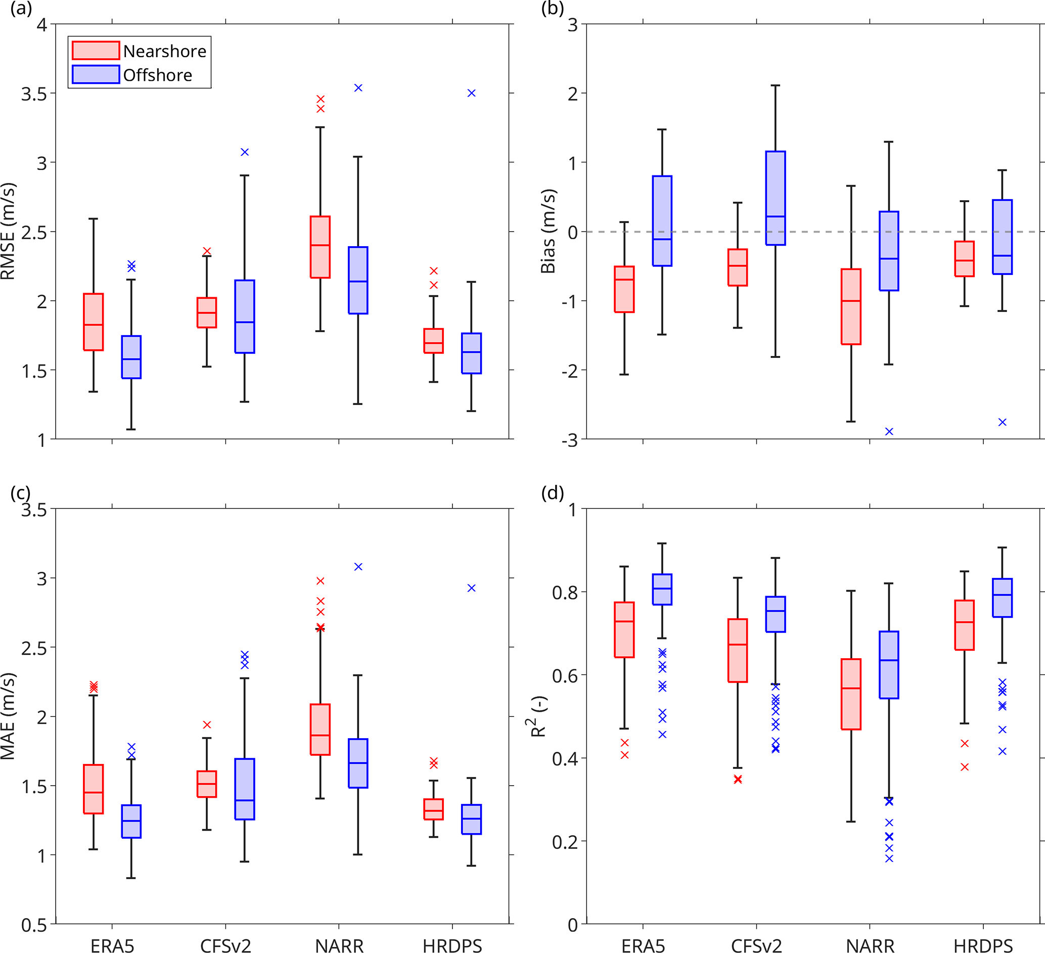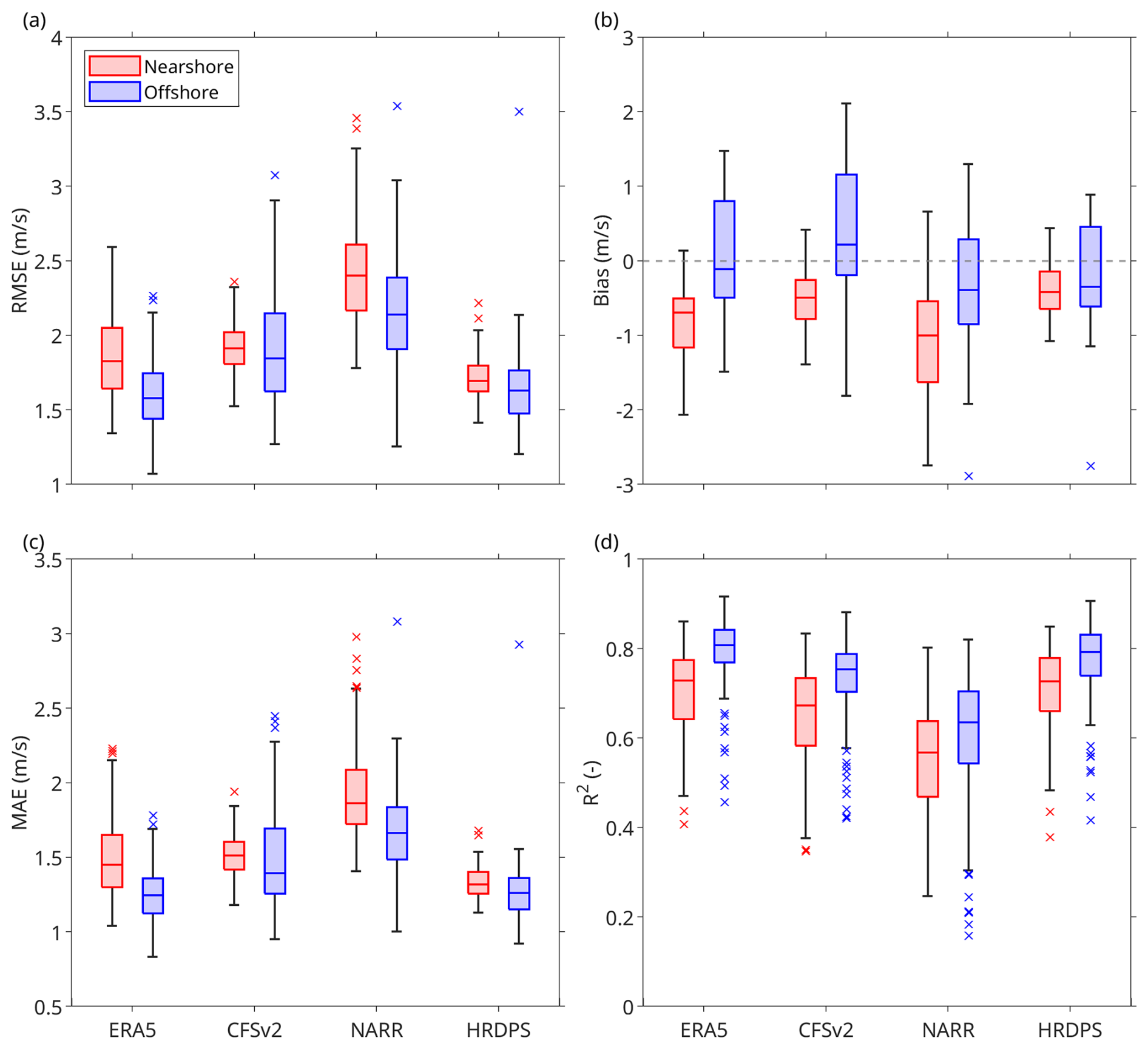 Figure 5Box charts summarizing the monthly values of four wind speed evaluation metrics, as shown in Fig. 4, of (a) RMSE, (b) bias, (c) MAE, and (d) R2 for the four wind datasets of ERA5, CFSv2, NARR, and HRDPS. Sites are categorized into (red) nearshore and (blue) offshore groups. Each box spans the first and the third quartiles of the data, with the horizontal line inside each box indicating the median value. The whiskers extending from the box represent the minimum and maximum values that are within the 1.5 times the interquartile range (IQR). The individual markers represent the outliers, defined as values exceeding 1.5 times the IQR.