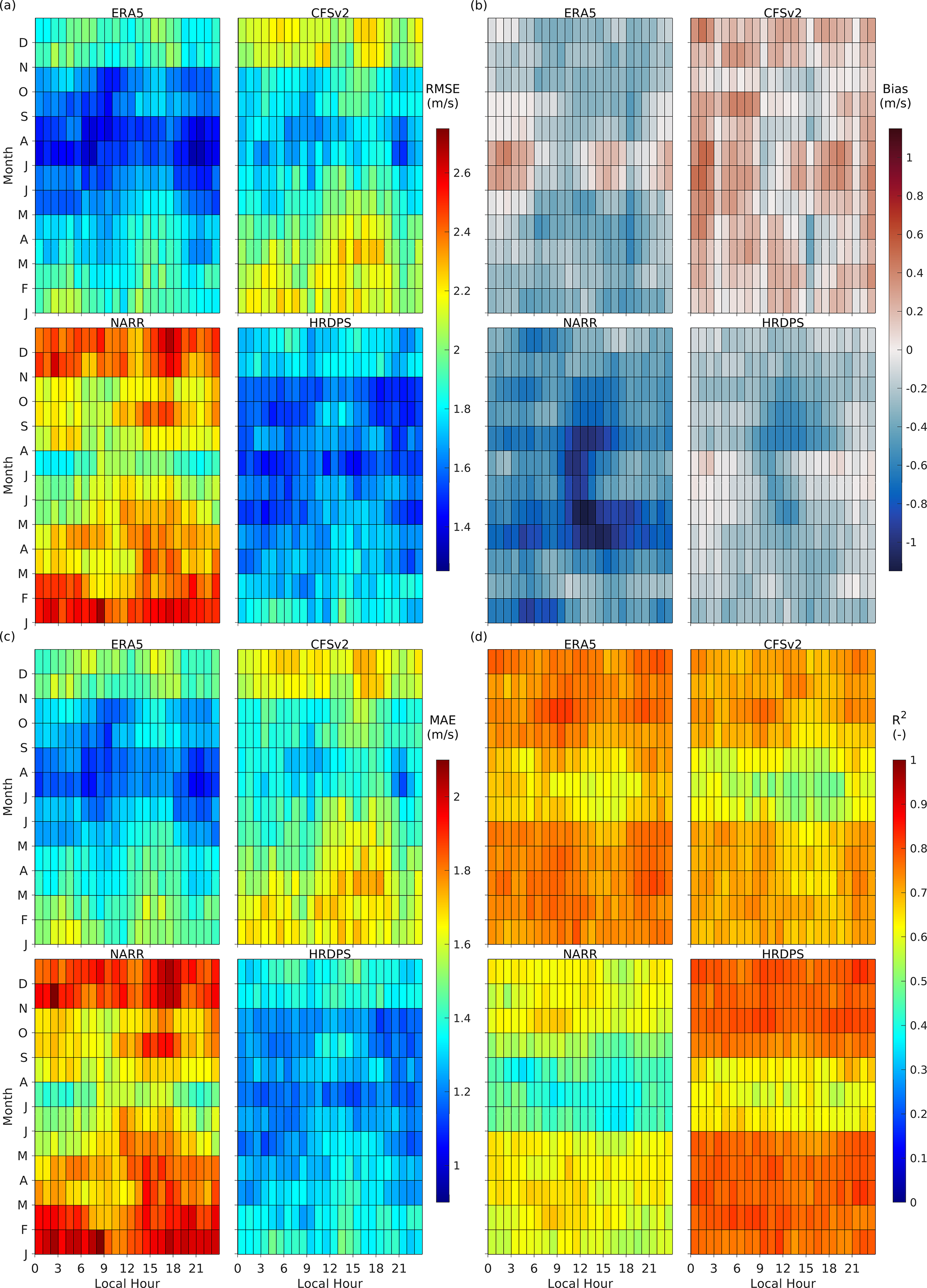 The MAE exhibited similar seasonal and diurnal patterns as those for RMSE, due to an inherent similarity between these two metrics (Fig. 6c). For R2, ERA5 and HRDPS generally exhibited higher values compared to the other two datasets (Fig. 6d). Additionally, R2 values were observed to be lower in the months from June to August.