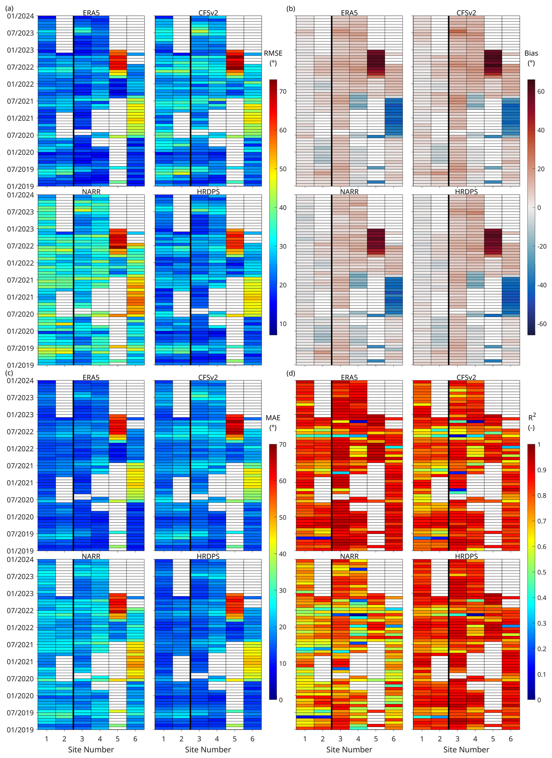 Figure 7Pseudocolour plots displaying monthly (a) RMSE (b) bias (c) MAE, and (d) R2 for wind direction for each dataset per wind observation site from 1 January 2019 to 31 December 2023. Sites 1 and 2 are representative of the nearshore (left of the bold black line in each subplot) and Sites 3–6 are representative of the offshore (right of the bold black line in each subplot) on the Scotian Shelf. The wind dataset is indicated at the top of each subplot. Blank areas (white pixels) indicate months and sites that had insufficient valid observation records (considered to be less than 120 observation records in a month). These were considered to be non-valid for the purposes of this study.