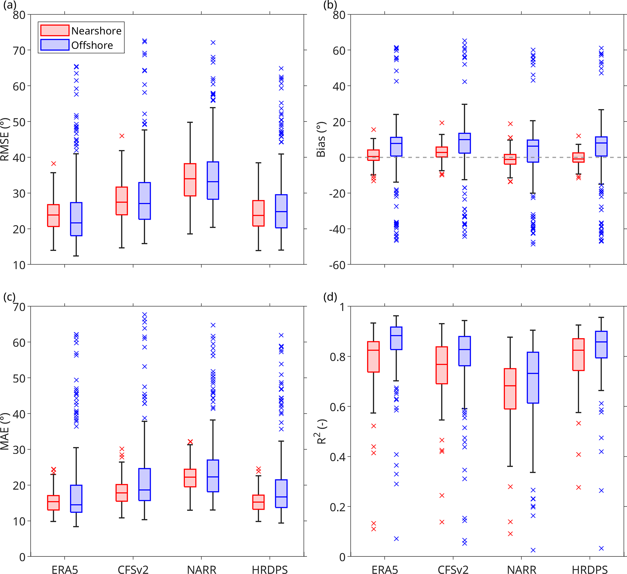 CFSv2: CFSv2 exhibited moderate performance across the metrics. Its 5-year averaged RMSE values were approximately 3–4° higher than ERA5 and HRDPS at nearshore sites and 2–6° higher at offshore sites. MAE values were also consistently higher by about 2–4° compared to ERA5. For the R2 metric, CFSv2 ranked third, with values about 0.04–0.09 lower than ERA5 across the offshore sites and lower than both ERA5 and HRDPS at nearshore sites. The bias values for CFSv2 were similar to those of other datasets.