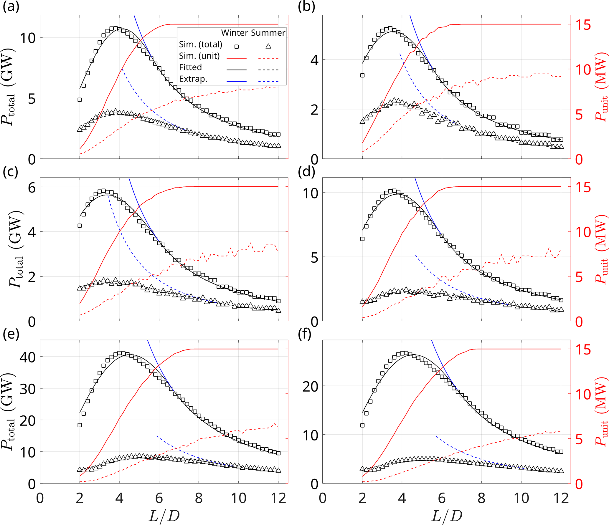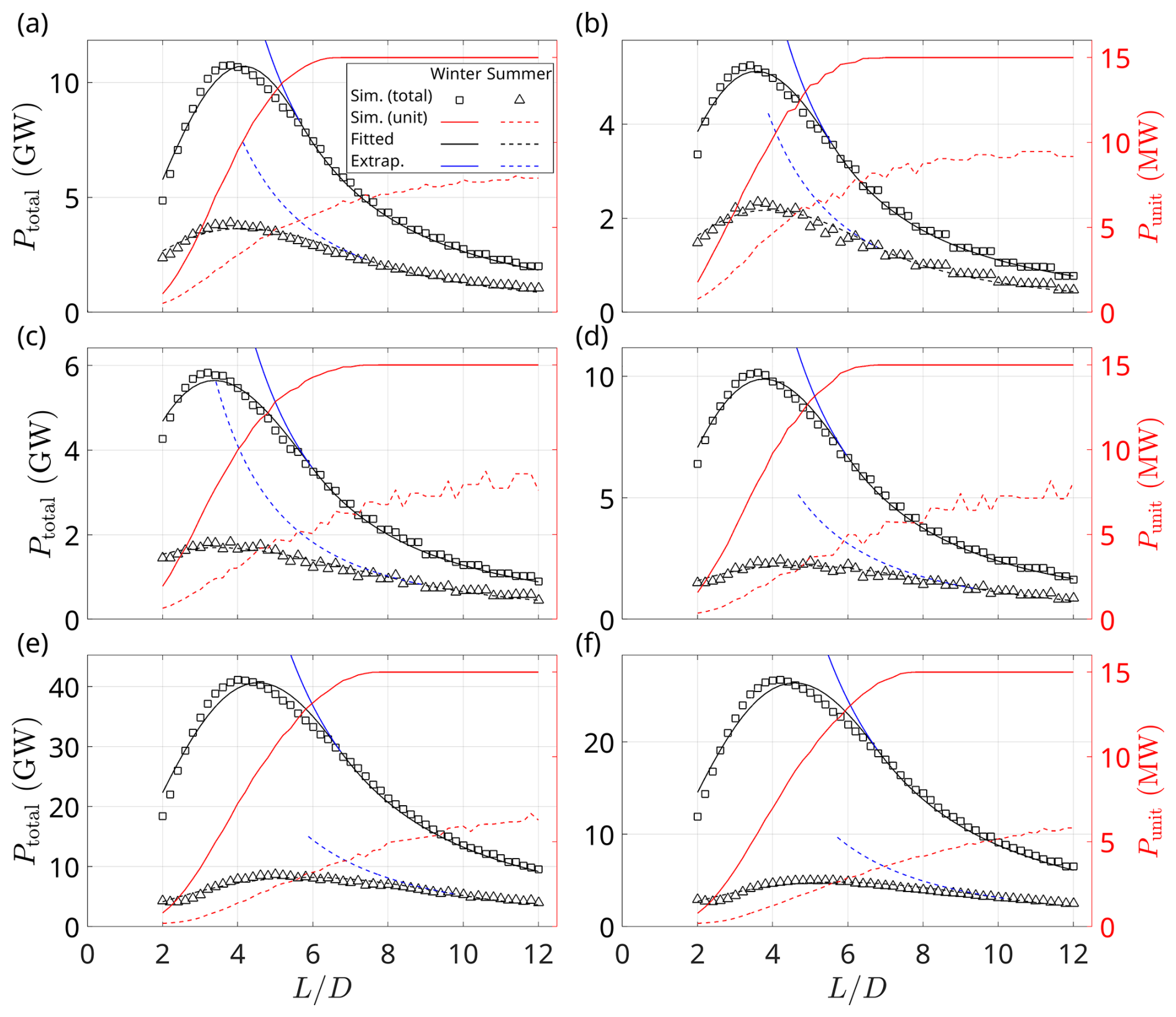 The wake effect was simulated using the Gaussian-profile wake deficit model developed by Bastankhah and Porté-Agel (2014). This model is known for its accuracy in representing wake expansion and velocity deficits, particularly for modern large-scale turbines. The Gaussian-profile wake model assumes self-similarity in the wind velocity deficit profile, which is valid in the far-wake region (Medici and Alfredsson, 2006). The extent of the near-wake region, which marks the onset of the far-wake region, depends on turbine characteristics (e.g., Ct, tip speed ratio, and number of blades) as well as on the ambient turbulence intensity (Sørensen et al., 2014). Bastankhah and Porté-Agel (2014) validated the model using both wind tunnel measurements and large eddy simulations under incoming turbulence intensities ranging from about 0.05 to 0.13 at hub height (Table 1 in their study). This demonstrated good agreement at downstream distances greater than approximately 2–3 D from the turbine. In Sect. 4.1, where simulations were conducted with constant wind speed and direction, the minimum turbine spacing was set to 2 D, corresponding to the lower bound of the model’s validated range. Results obtained for spacings within 2–3 D should therefore be interpreted cautiously. However, in Sect. 4.3, where simulations were driven by time-varying wind speed and direction, the minimum turbine spacing was 3.4 D, which lies well within the far-wake regime.