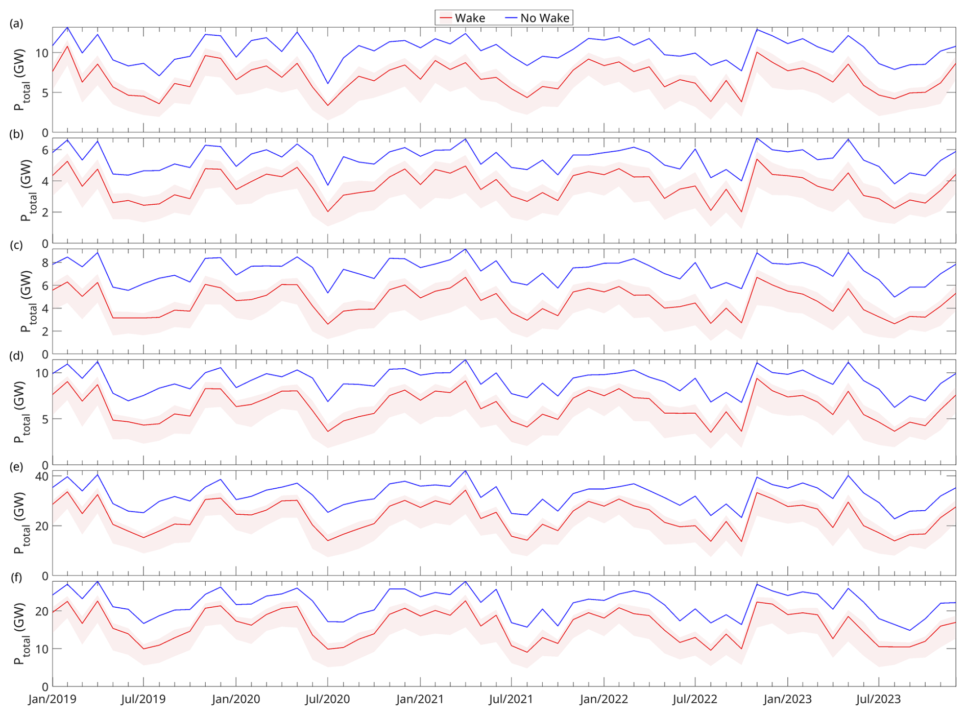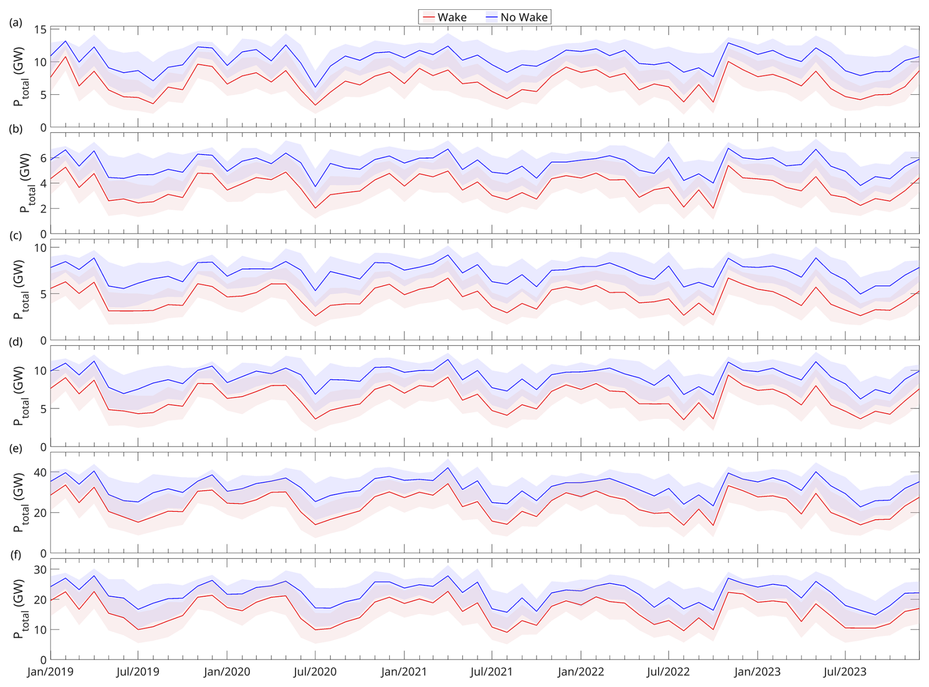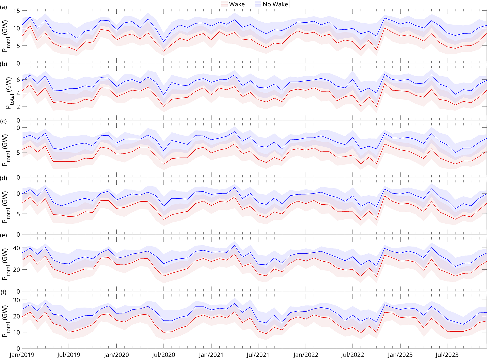 In general, studies that have estimated offshore wind farm energy potential from wind datasets (e.g., Wang et al., 2022; Gualtieri, 2021; Kardakaris et al., 2021; Fernandes et al., 2021) typically estimate wind power using simple formulas or interpolate using wind turbine power curves. However, these approaches can overlook a key aspect of real-world conditions; primarily, wind turbines can generate wake effects that reduce wind speeds available to downstream turbines, leading to lower overall energy production from a wind farm. Wake effects have been estimated to result in energy losses on the order of 10 % to 25 % in medium-sized offshore wind farms, such as the Horns Rev, Lillgrund, and Nysted wind farms (Barthelmie et al., 2009, 2010; Niayifar and Porté-Agel, 2015; Simisiroglou et al., 2019; Wu and Porté-Agel, 2015). For large-sized offshore wind farms, Pryor et al. (2021) estimated, through simulation, an overall 35.3 % energy loss associated with wake effects.