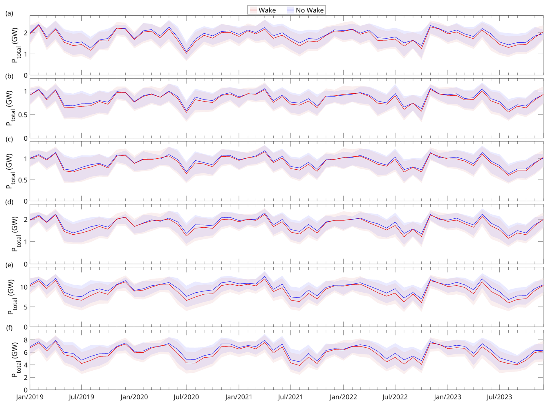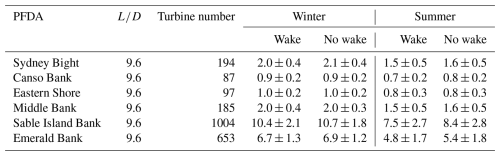 Many studies that have simulated offshore wind farms have focused on annual or long-term mean energy production or capacity factors (Pryor et al., 2021; Simisiroglou et al., 2019; Wu and Porté-Agel, 2015), where the wind inputs consisted of several combinations of constant wind speeds and directions derived from historical wind statistics. However, the temporal variation of power production has received comparatively less research focus (Wang et al., 2022). This study helps to address this gap by analyzing the monthly time series of power production across PFDAs on the Scotian Shelf. Seasonal variations were pronounced, with summer production in the dense turbine layout being 34 % to 40 % lower than in winter. In the less dense 9.6 D layout, reductions in summer power production ranged from 20 % to 28 % compared to winter. Despite these fluctuations, seasonal wind power generation patterns closely aligned with the seasonal variation in the Nova Scotia electricity demand, which peaks in the winter and declines in the summer. This alignment suggests that offshore wind has the potential to complement Nova Scotia’s seasonal electricity demand, reinforcing the importance of incorporating temporal variability into wind energy assessments.