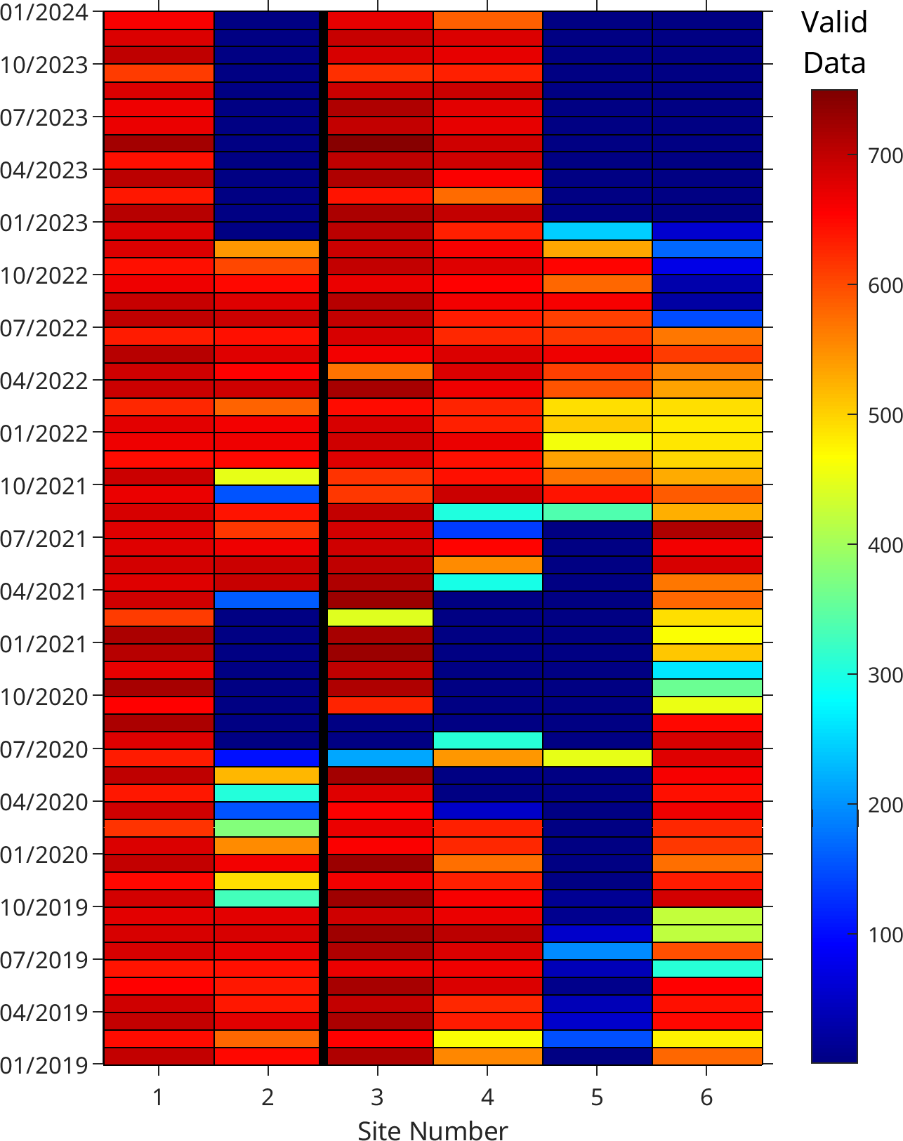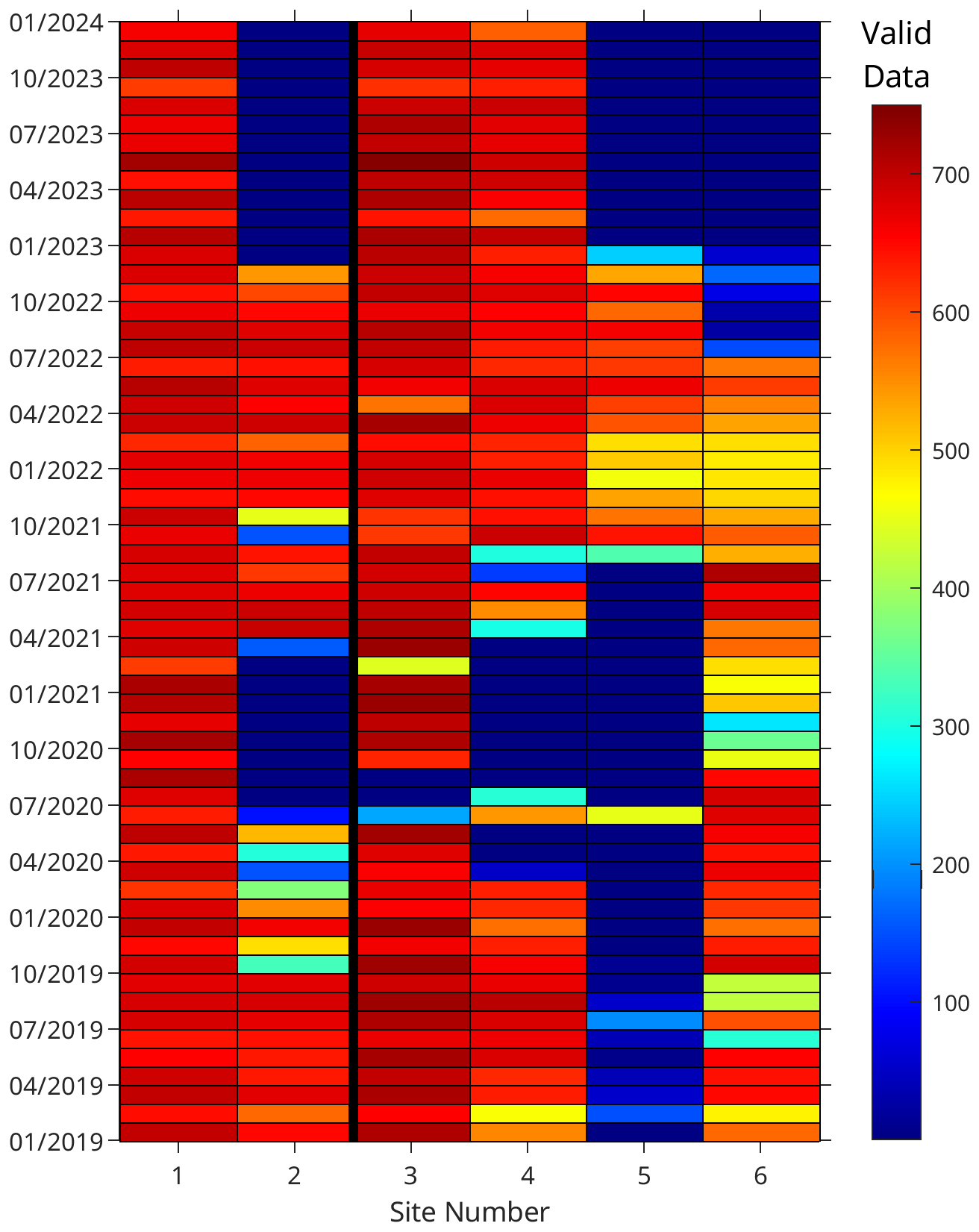 Figure A1Pseudocolour plots showing the number of the valid observation data in each month from 1 January 2019 to 31 December 2023. Sites 1 and 2 are representative of the nearshore (left of the bold black line) and Sites 3–6 are representative of the offshore (right of the bold black line) on the Scotian Shelf. Refer to Table 1 and Fig. 1 for information of the observation sites.