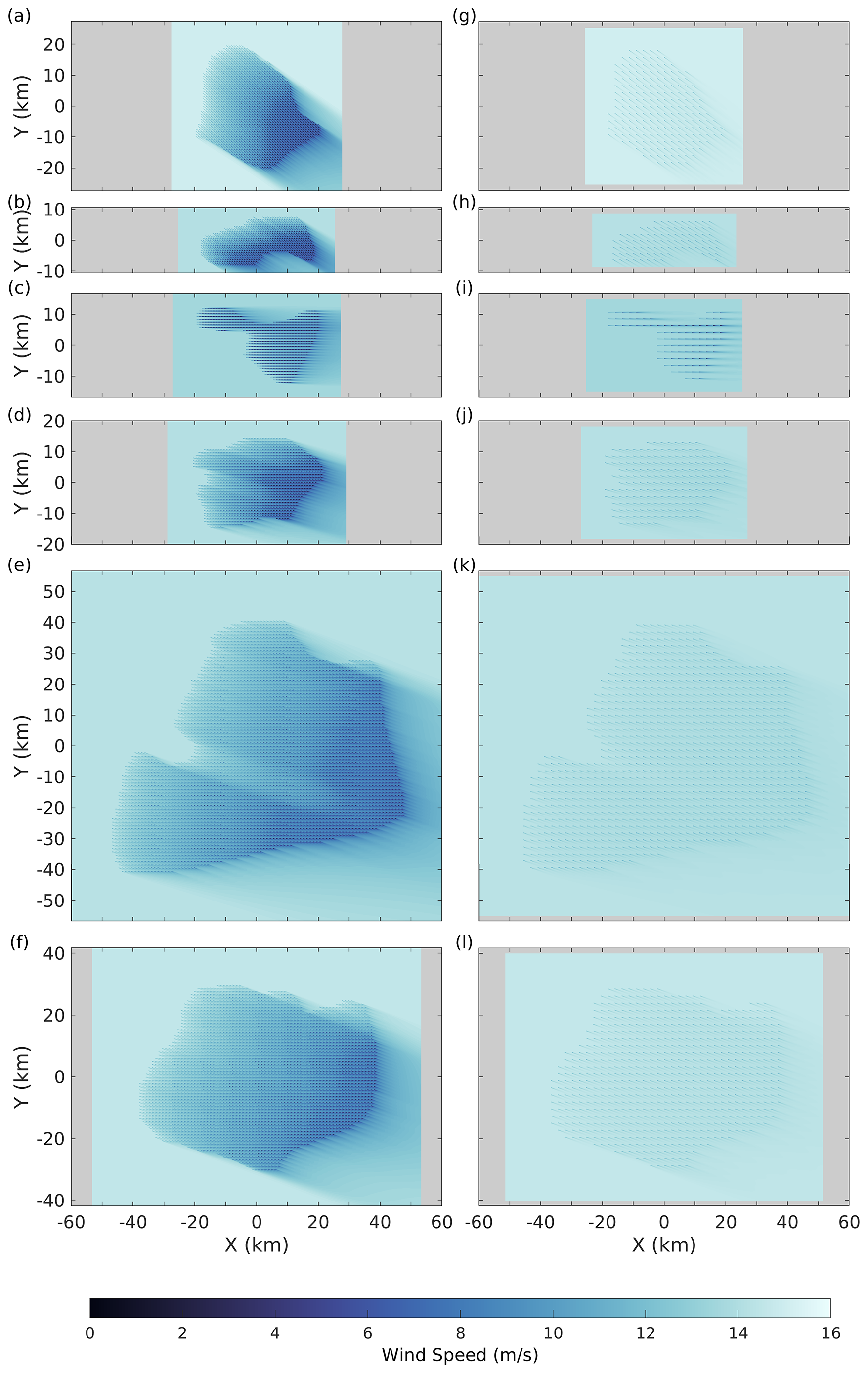 Figure A2Diagrams of the layouts of wind turbines for the six potential future development areas (PFDAs): (a, g) Sydney Bight, (b, h) Canso Bank, (c, i) Eastern Shore, (d, j) Middle Bank, (e, k) Sable Island Bank, and (f, l) Emerald Bank. The normalized turbine spacings () for the left panels are 4.1, 3.7, 3.4, 4.2, 5.2, and 5.1, respectively, and 9.6 for all right panels. Refer to Fig. 1 for the locations of PFDAs on the Scotian Shelf.