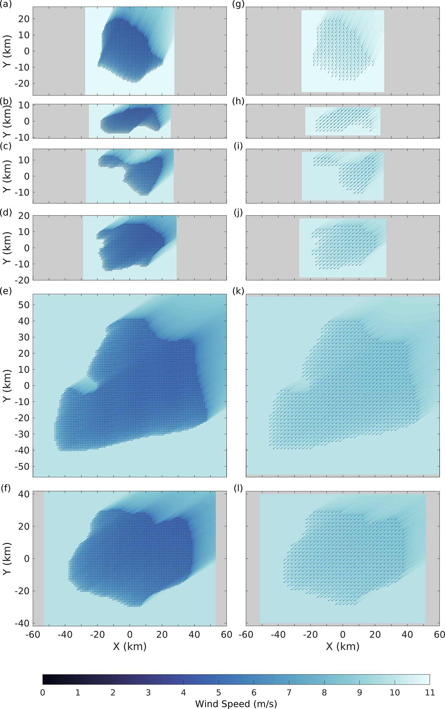 Figure A4Flow maps of wind speed at the hub height of 150 m and wake effects simulated using PyWake for the six potential future development areas (PFDAs): (a, g) Sydney Bight, (b, h) Canso Bank, (c), (i) Eastern Shore, (d), (j) Middle Bank, (e, k) Sable Island Bank, and (f, l) Emerald Bank during summer, with the layouts the same as in Fig. A2. The wind dataset used was ERA5. Refer to Fig. 1 for the locations of PFDAs on the Scotian Shelf.