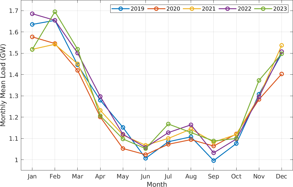 Figure A5Monthly mean load for Nova Scotia, Canada, in 2019–2023. Data sourced from the website of Nova Scotia Power: https://www.nspower.ca/oasis/monthly-reports/hourly-total-net-nova-scotia-load (last access: 4 February 2025).