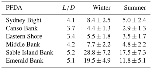 Hourly wind data from meteorological stations in the Scotian Shelf area were obtained from the Government of Canada's Historical Climate Data website (https://climate.weather.gc.ca, last access: 19 August 2024). Two island-based meteorological stations located at a nearshore site (Beaver Island) and an offshore site (Sable Island) on the Scotian Shelf were selected for analysis (Fig. 1). At the meteorological stations, wind speed and direction were measured using type U2A cup anemometers mounted on masts at a height of 10 m above ground level (Environment and Climate Change Canada, 2023; Wan et al., 2010). For the oceanic domain, wind data were obtained from moored marine buoy sites. Four buoys were selected based on data coverage for the analysis period and minimal gaps in observed wind data (Fig. 1). These data were obtained from the Fisheries and Oceans Canada (DFO) Marine Environmental Data Section Archive (https://meds-sdmm.dfo-mpo.gc.ca, last access: 30 May 2024). On the marine buoys, two types of anemometers – the R. M. Young helicoid propeller-vane anemometer and the Vaisala WS425 ultrasonic – were mounted at different positions but at approximately the same height of 5 m above the sea surface (Thomas and Swail, 2011). Upon comparison, the wind data records from the Vaisala WS425 ultrasonic anemometers were found to be more persistent, with fewer invalid data points over time. Therefore, only data from this instrument were used in the analysis. The wind direction from observations at all sites, as well as throughout this paper, refers to the direction from which the wind blows, expressed in units of degrees true, meaning degrees clockwise from true north. All sites were summarized in Table 1. The sites were numbered in a sequence based on distance away from the coastline of Nova Scotia and in a northeast to southwest direction. Due to different regimes of wind dynamics (Cañadillas et al., 2023; Djath et al., 2022), the sites have been categorized as nearshore (Sites 1 and 2) and offshore (Sites 3–6).