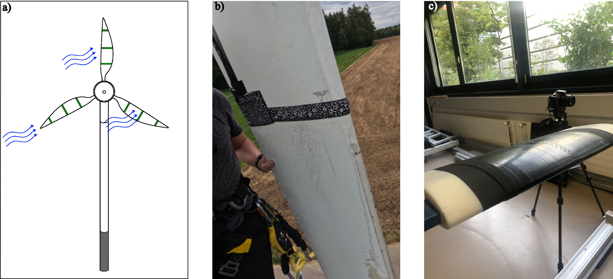 Figure 1(a) Intended use of Aerosense sensing units (green stripes) on a wind turbine in a real-world monitoring scenario, designed after Barber et al. (2022). (b) Aerosense system deployed on a wind turbine. (c) Close-up photo of the Aerosense sensing node (from the experiments conducted for this article).