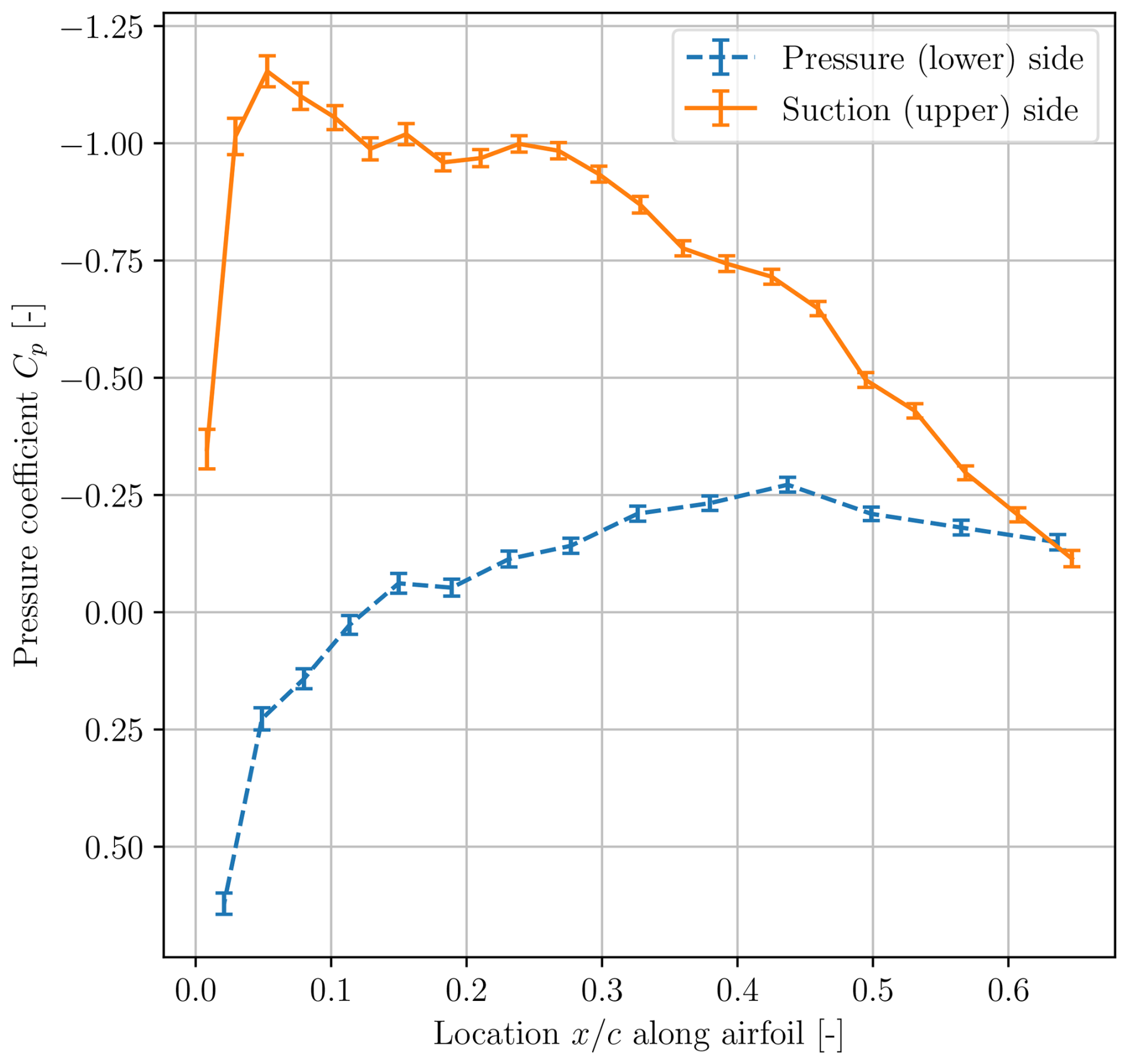 Figure 2Mean value of pressure distribution time series over NACA 633418 with an 8° angle of attack, a wind velocity of v=24 m s−1, an excitation frequency fh of 1.9 Hz, and a crack length of 0 % of the beam width. Error bars indicate the standard deviation. The pressure distribution was recorded using the Aerosense system in the experiments described in Sect. 3.