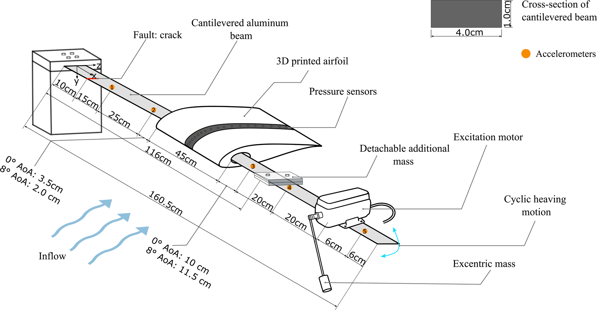Figure 4The experimental setup at EPFL consists of a cantilever beam carrying an airfoil, an excitation motor, and a detachable additional mass, and it is positioned in the open test section of a wind tunnel. Measurement instrumentation is present on the airfoil in the form of the Aerosense system and on the cantilever beam in the form of accelerometers. The width and height of the rectangular cross-section of the beam are shown in the upper-right corner of the figure.