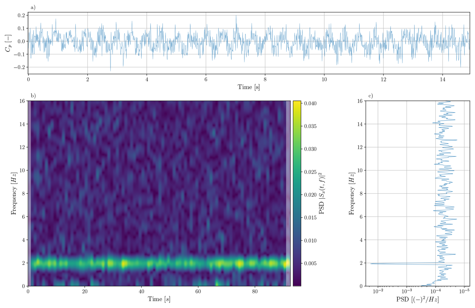 Figure A1(a) Extract of the pressure time history recorded by sensor 14, located at on the suction side of the airfoil, with 8° AoA under V=24 m s−1 and fh=1.9 Hz in experiment 16. Panel (b) shows how the spectrum of the pressure time history of sensor 14 of experiment 16 with 8° AoA varies over the whole duration of the experiment via a spectrogram. The spectrogram is computed using the discrete short-term Fourier transformation of SciPy (Virtanen et al., 2020). The shaded areas at the left and right ends of the spectrum indicate areas affected by sliding windows that are partially outside of the analyzed signal Panel (c) depicts the PSD of the same signal computed over the whole duration of experiment 16 and is calculated with Welch's method and its implementation in SciPy (Virtanen et al., 2020).