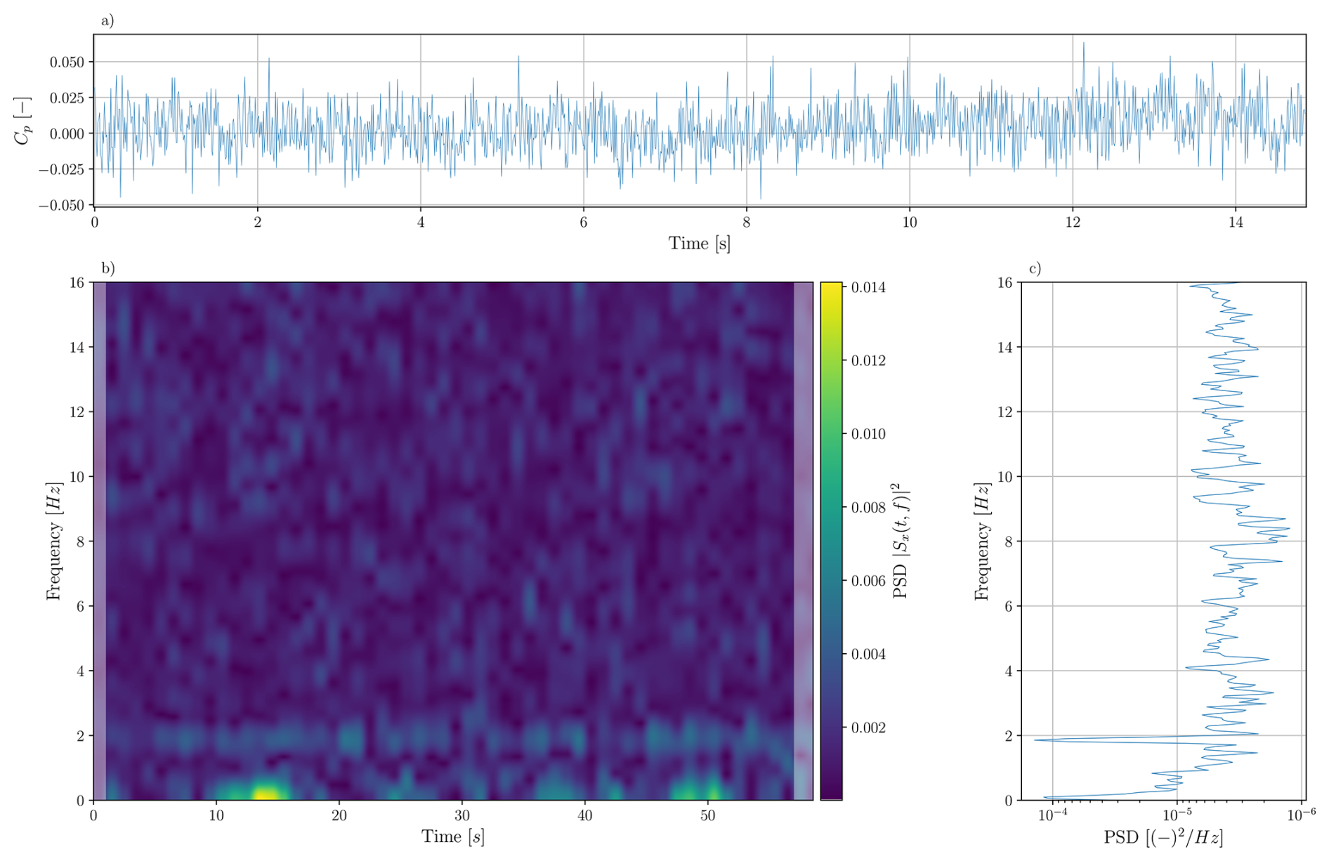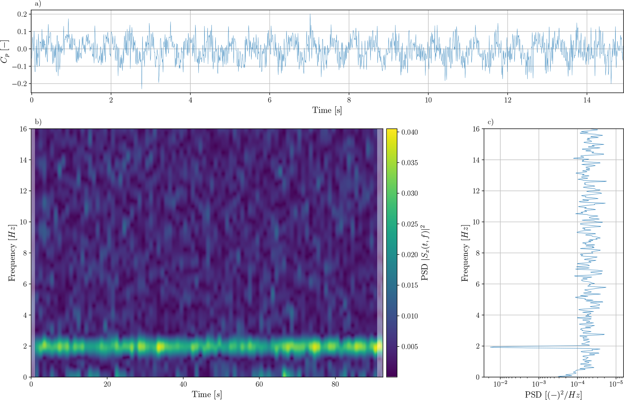 Figure 9(a) Extract of the pressure time history recorded by sensor 14, located at on the suction side of the airfoil, with 0° AoA under V=12 m s−1 and fh=1.0 Hz in experiment 3. Panel (b) shows how the spectrum of the pressure time history of sensor 14 of experiment 3 with 0° AoA varies over the whole duration of the experiment via a spectrogram. The spectrogram is computed using the discrete short-term Fourier transformation of SciPy (Virtanen et al., 2020). The shaded areas at the left and right ends of the spectrum indicate areas affected by sliding windows that are partially outside of the analyzed signal. Panel (c) depicts the PSD of the same signal computed over the whole duration of experiment 3 and is calculated with Welch's method and its implementation in SciPy (Virtanen et al., 2020).