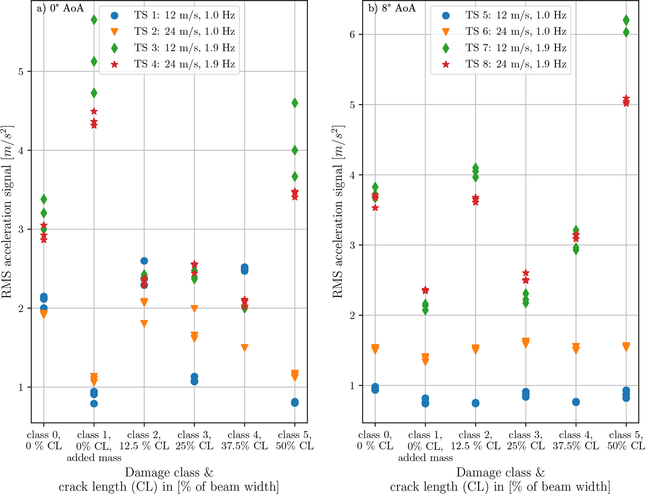 Figure 11RMS values of the acceleration signals recorded by accelerometer 5, located at the tip of the cantilever beam, for all test series (TS) and all damage classes. Each data point marks the RMS value of a single acceleration measurement. The color and marker of each data point indicate the corresponding TS and thus the approximate loading conditions. Panel (a) shows the RMS values of experiments conducted with 0° AoA. Panel (b) displays the RMS of acceleration measurements recorded with 8° AoA. Since three measurements were conducted for each combination of inflow conditions and structural state, three circles are visible per TS/damage class combination.