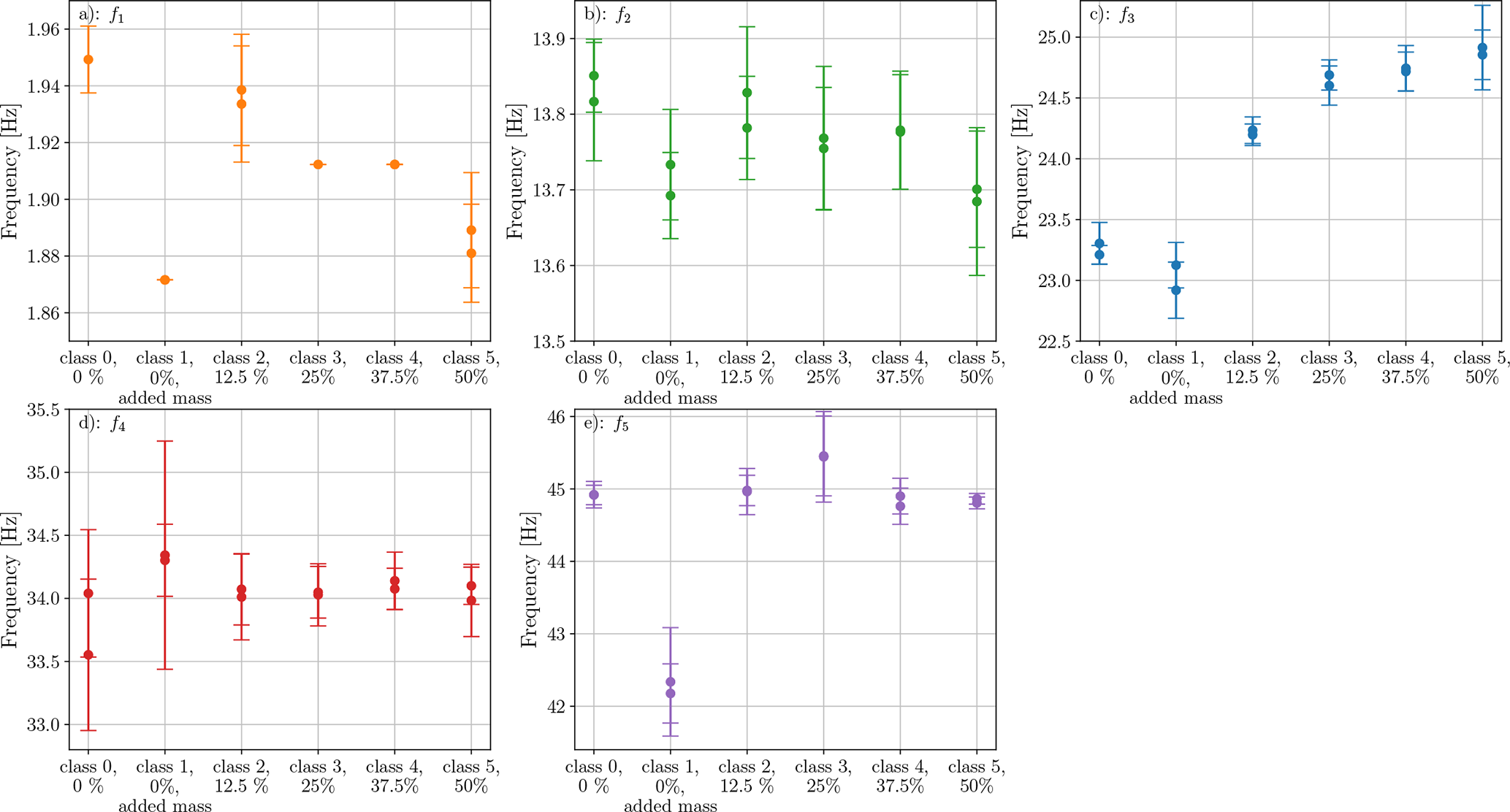 Figure 12Evolution of the mean values (circular markers) and standard deviations (error bars) of the first five eigenfrequencies fi, determined with AFDD and clustering, plotted over the damage classes. The exact values of fi for each damage class are given in Table A4. Eigenmode ϕ1 could not be detected in experiments 6 and 63, which correspond to damage classes 0 and 3; thus, for f1, there is only one value presented in damage classes 0 and 3.