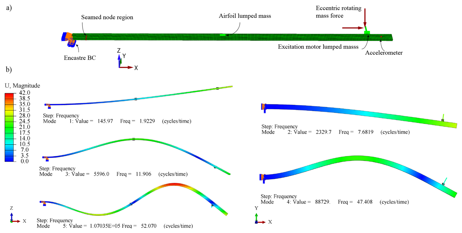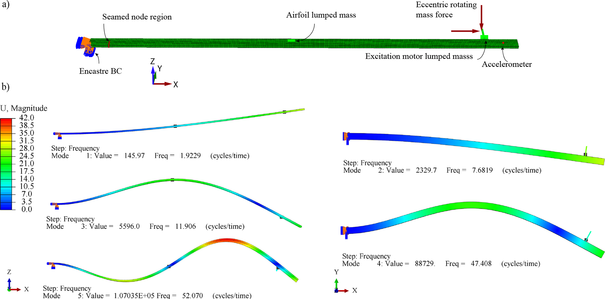 The flap-wise vibration of a rotating WTB is strongly affected by gravitational forces (Diken and Asiri, 2021). For that reason, we introduce periodic forcing at the tip of the beam to emulate the flap-wise vibration of a rotating WTB caused by the gravitational forces. Furthermore, we aim for a heaving amplitude of 5 to 10 cm at the mid-section of the airfoil, to obtain a non-stationary aerodynamic pressure distribution affected by the heaving, and choose both the tip mass and the excitation frequency accordingly.