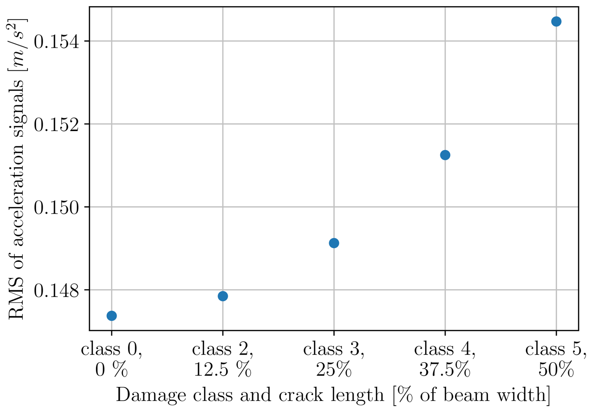 The choice of examining the acceleration amplitude as a proxy to damage is motivated by two facts: firstly, the cantilever beam in the experimental setup is expected to vibrate in a quasi-steady state after initial transients have been damped out, under the influence of the periodic forces FΩ caused by the rotating mass and the aerodynamic loading Faero. We assume here that the system oscillates in a quasi-steady state, since FΩ and the lift and drag forces of the airfoil vary periodically and the motion of the blade may additionally induce small vertical, transient loads caused by vortex shedding. As a result of the quasi-steady vibration state, a reduction in the beam stiffness is expected to lead to amplified vibration amplitudes under the prescribed loading. The more usual features to detect damage based on output-only acceleration data, such as eigenfrequencies, may be non-trivial to determine under forced conditions (when the input force is not measured). Secondly, the choice of analyzing the evolution of the acceleration amplitude is motivated by its linkage to pressure. Based on Eq. (7), the velocity and thus also the displacement x(t) and acceleration of the airfoil serve as inputs to the aerodynamic pressure distribution and its variation. To better understand the variation in the pressure distribution, we subsequently analyze the evolution of its inputs that are related to the dynamics of the cantilever beam by examining the acceleration amplitude with growing damage. Since the beam vibrates in a quasi-steady state, the evolution of the displacement and velocity amplitudes with increasing damage can be approximately inferred from the evolution of acceleration amplitudes. To analyze the evolution of the acceleration amplitudes with increasing damage, we compute the root-mean-square (RMS) value of the acceleration time histories, as this feature characterizes the average amplitude of a noisy signal. The RMS of a discrete time signal yk with k ϵ is computed as . For computing the RMS, we neglect the first 40 s and the last 10 s of each acceleration signal to limit the influence of initial transients or shutting down the rotational motor too early.