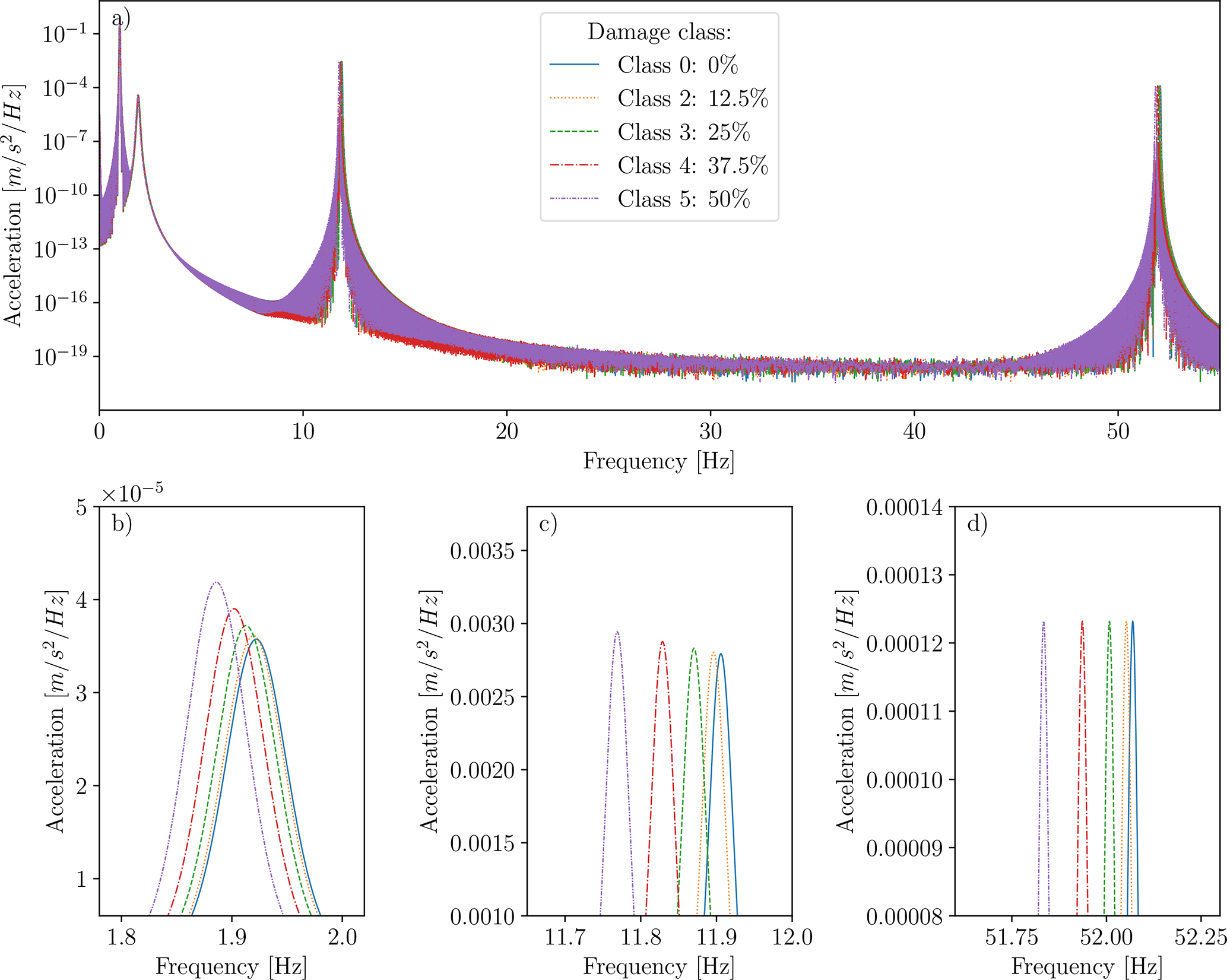 In this section, we use the reference acceleration measurements (see Sect. 3.3) to investigate the intricacy of the damage detection and classification task we attempt to solve with our proposed approach, as introduced in Sect. 4. Using the hypothesis of Sect. 2, the preceding section discusses how to adopt a CNN-based scheme to detect structural damage from aerodynamic pressure measurements in a supervised manner. An alternative approach to damage detection would be to rely on vibration-based information. By analyzing the measurements of the installed acceleration sensors, we can more targetedly investigate the dynamic behavior of the system that was previously only indirectly observed via the aerodynamic pressure measurements. For that purpose, we analyze subsequently how the amplitudes of the acceleration signal at the tip of the cantilever beam and the eigenfrequencies fi of excited eigenmodes ϕi develop with increasing crack length. Finally, we also discuss the influence of the orientation of the crack on the dynamics of the cantilever beam using a FE model of the cantilever beam.