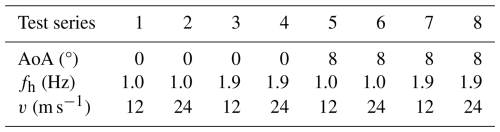 Table A1Overview of experiments and their boundary conditions. The entries in columns 1, 2, and 3 are the identifiers of the measurements conducted under the boundary conditions of the same row. This numbering is applied for both the 0 and 8° AoA datasets.