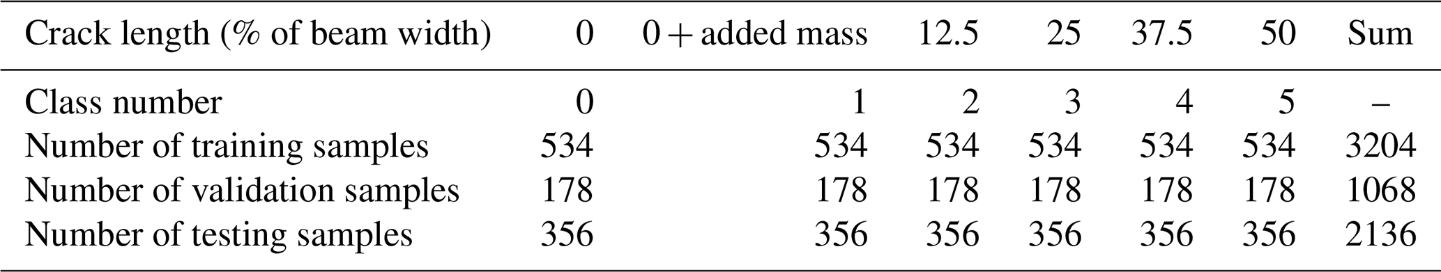 Consequently, we employ 48 experiments to generate the training samples and 24 experiments for the test samples. From each experiment, we neglect the first 40 s and the last 10 s to reduce the influence of transients from switching on the harmonic excitation and from possibly switching off the harmonic excitation too early. From the remaining approximately 100 s, we extract 89 multivariate signal windows of 1.5 s with an overlap of approximately 30 %. As a result, there are 4272 samples available for training and 2136 samples available for testing (see Table 3). Finally, 25 % of the training samples are reserved for validation purposes, and only the remaining 75 % of the training samples are de facto used for training the CNN. Thus, per damage class, there are 534 samples available for training, 178 samples for validation, and 356 samples for testing, as presented in Table 3.