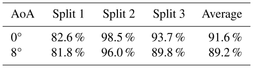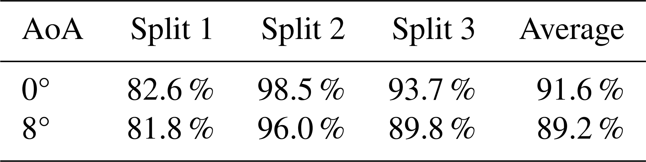 Table 4Accuracy for all splits for 0 and 8° AoA. The classification accuracy given for a single split is the average of the classification accuracy over the six balanced classes of that split.
