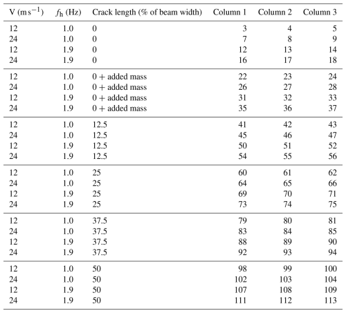 We use the standard values for μ∞ and ρ∞ at sea-level altitude and 15 °C, as these approximate the environmental conditions during the experiments. Two AoAs, two wind speeds, and two heaving frequencies result in eight test series (TSs) that are summarized in Table 1. For each test series, we consider five different crack lengths, along with one state with an added mass and a crack length of 0 mm. While the cuts with different lengths should represent the stiffness reduction in cracks of different length, the added mass is meant to represent ice accretion, also known as “icing”, on the WTB. Thus, there is a total of six structural states per test series (see Table 3). For each combination of structural state, AoA, wind velocity, and heaving frequency, we conduct three measurement runs (later also called “experiments”) of approximately 150 s. During the first 15 s, the airfoil is only aerodynamically loaded, and, for the remaining 135 s, aerodynamic and harmonic forces both act on the airfoil simultaneously. After each “test block” consisting of a set of three experiments, we conduct zeroing measurements and re-fasten the screws on the support structure to ensure that the structural boundary conditions remain identical for all experiments. As during the zeroing measurements the cantilever beam is only loaded by ambient vibrations, the acceleration recordings of these measurements will be used later for structural identification. Every measurement and experiment is identified by its unique number; an overview of the numbering of experiments is given in Tables A1 (harmonic and wind loading), A2 (only harmonic loading), and A4 (ambient loading), along with the file “design of experiments” in the Supplement. The same experimental numbering is applied for both AoAs.