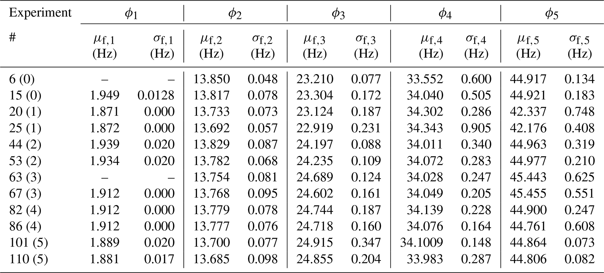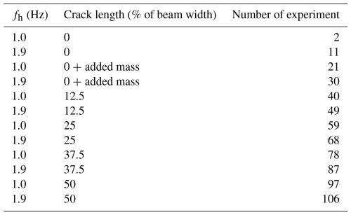 Table A4Natural frequencies fi of the modes found with AFDD and clustering below 60 Hz, described by their mean μf,i and standard deviation σf,i, for all structural states and rounded to three decimal digits. The eigenfrequencies fi are associated only with the vertically oscillating eigenmodes of the cantilever beam.