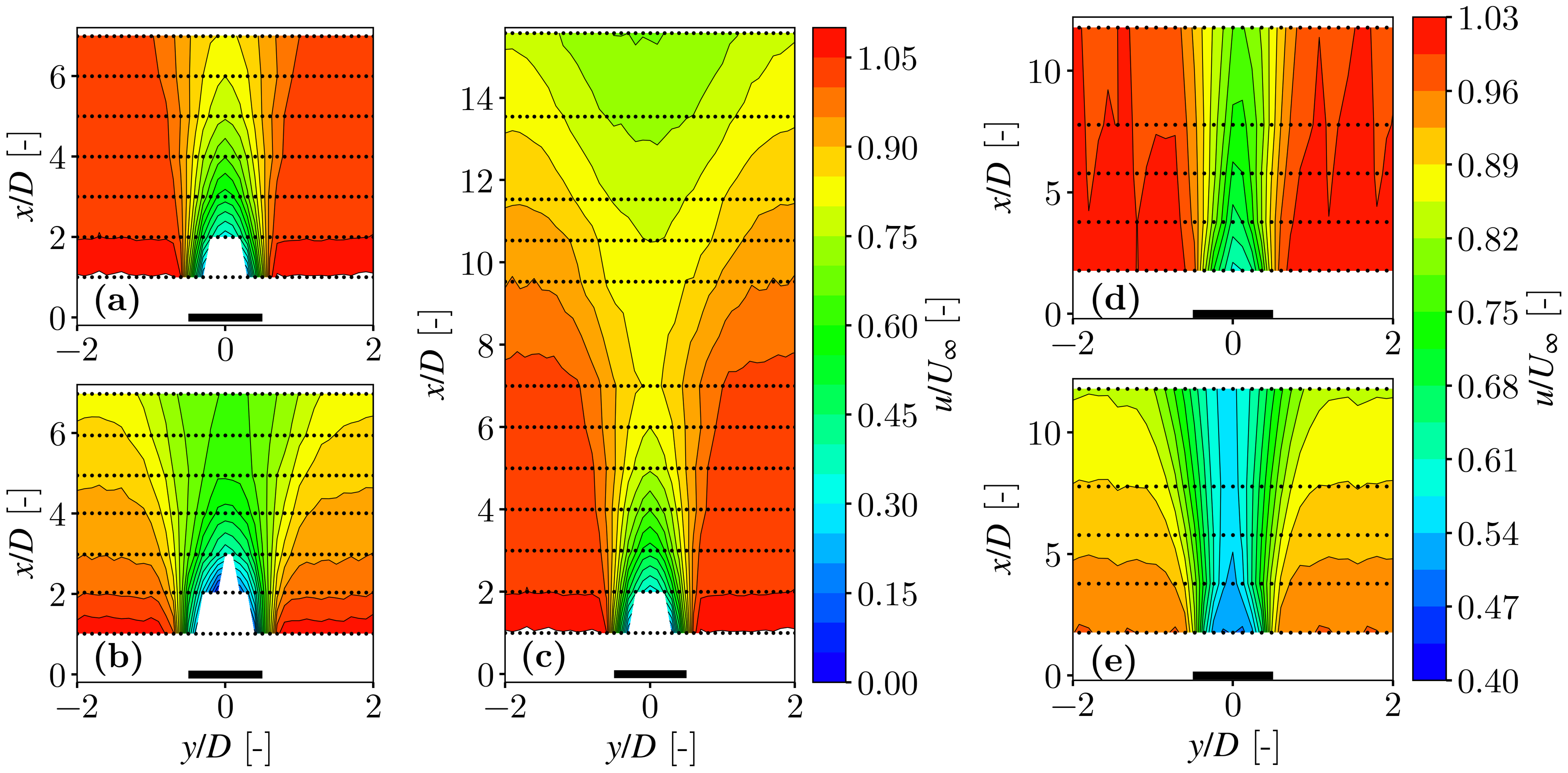 Figure 4Horizontal profiles of the normalized averaged streamwise velocity obtained for all cases studies: disc placed in the test section (a), the diffuser section (b), and the test section but expanding through this section and the diffuser one (c). The panel also includes the cylinder placed in the test (d) and in the diffuser (e) section. The black dots represent the points where measurements were taken, and the solid black lines represent the velocity contours. Data were interpolated to generate a map where, in order to better show the details of each wake, the colour scale among panels is not identical.