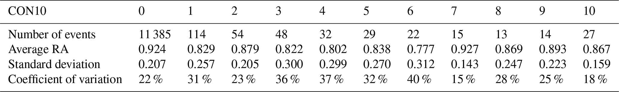 Figure 3Panel (a) shows the average RA for each CON10 value ranging from 0 to 10 min. Panel (b) shows the average RA for C10 intervals between 0 and 14 mm per 10 min, divided into five subintervals of the same size.