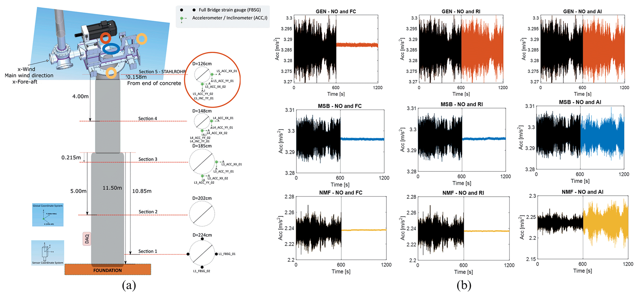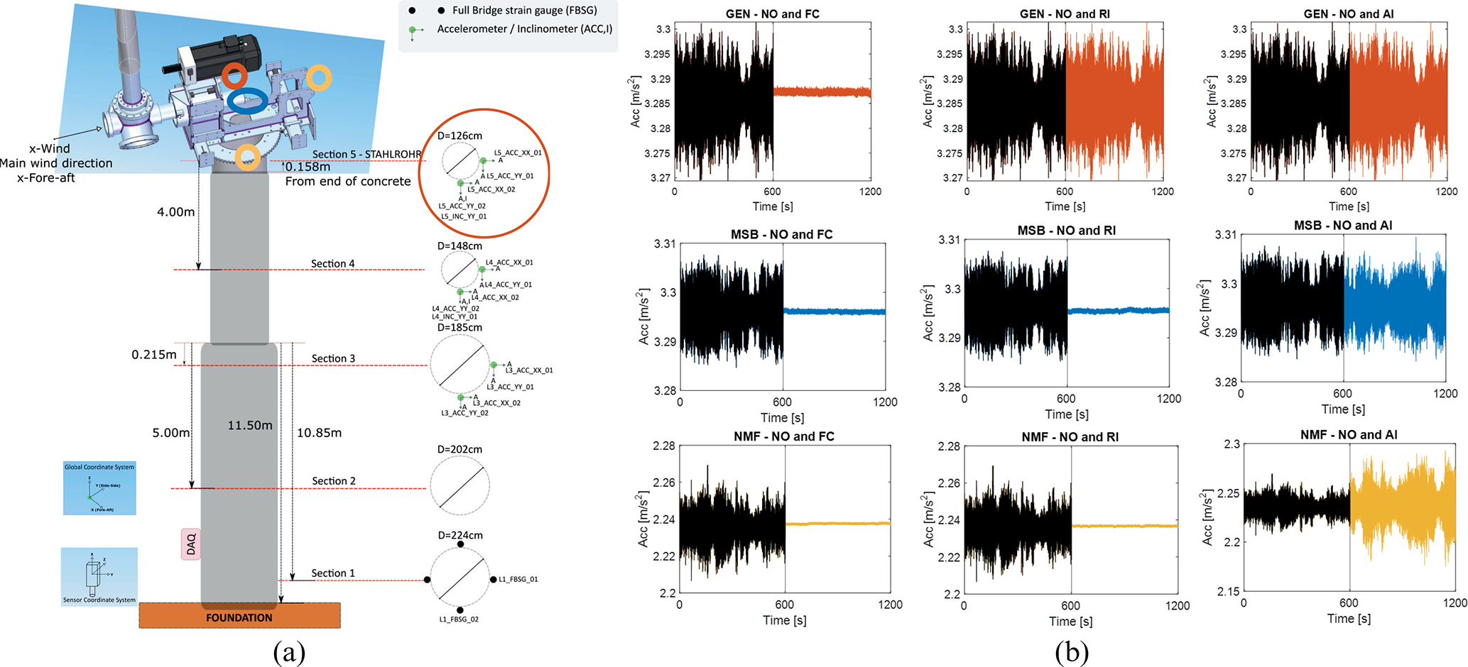 Figure 2Schematic representation of the turbine sensor channel and location (Chatzi et al., 2023). SCADA data and accelerometers marked in orange, blue, and yellow colours are adopted in the monitoring (a). Temporal signal data of the turbine's NO and operation with failures (b): top: sensor GEN NO-FC, NO-RI, and NO-AI placed from left to right, respectively; middle: sensor MSB NO-FC, NO-RI, and NO-AI; and bottom: sensor NMF NO-FC, NO-RI, and NO-AI.