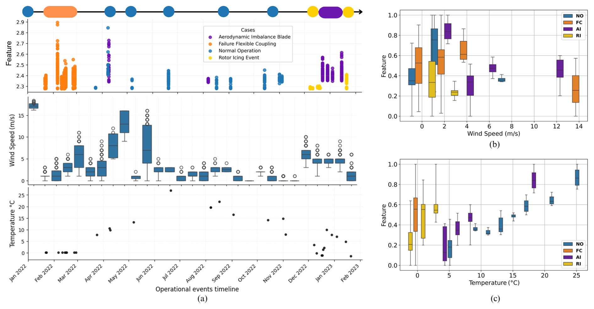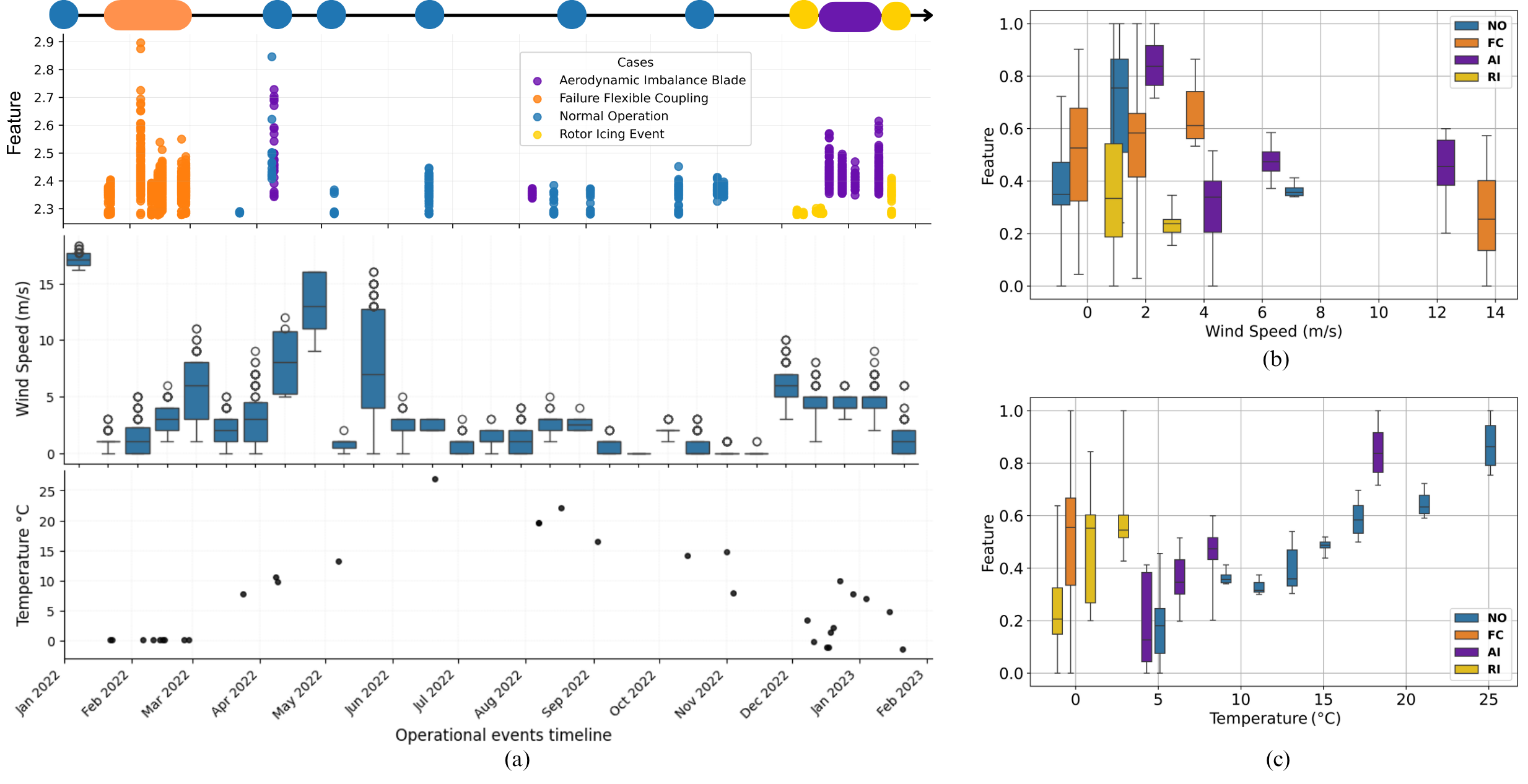 Figure 3The feature dataset volume over the monitoring timeline categorized by yellow indicates RI, blue denotes NO, purple corresponds to AI, and orange represents the FC condition (a) (top). Wind speed boxplot (a) (middle), and mean temperature ((a) bottom). Boxplot of L05 sensor feature by wind speed variation (b) and feature by temperature variation (c).