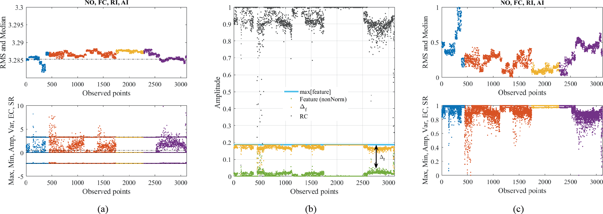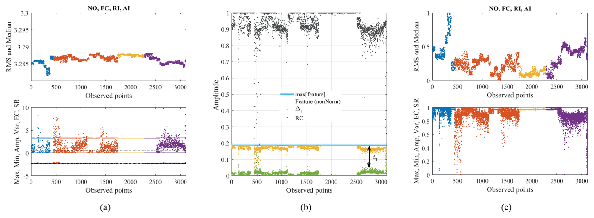 Figure 4(a) Non-normalized features grouped by similarity under different operating conditions: NO – blue, FC – orange, RI – yellow, and AI – purple. (b) Demonstration of the scaling and normalization on the Amp feature related to Eq. (1). Scaled and normalized features grouped by similarity under different conditions (c).
