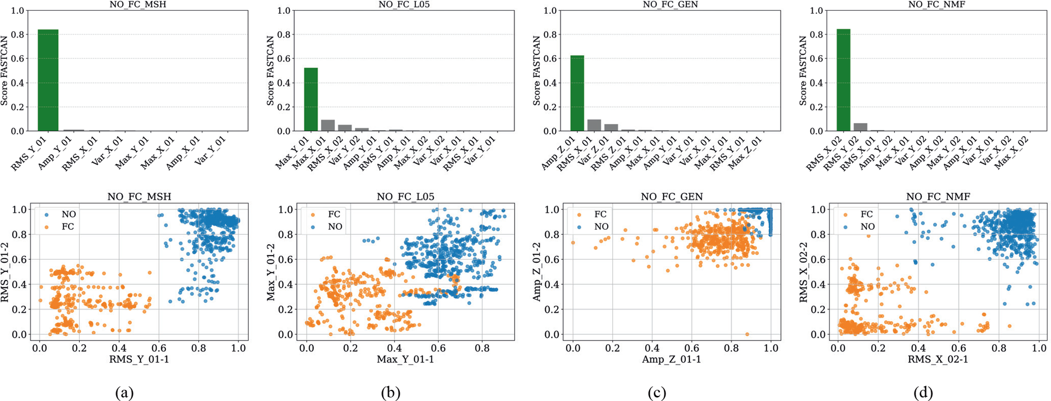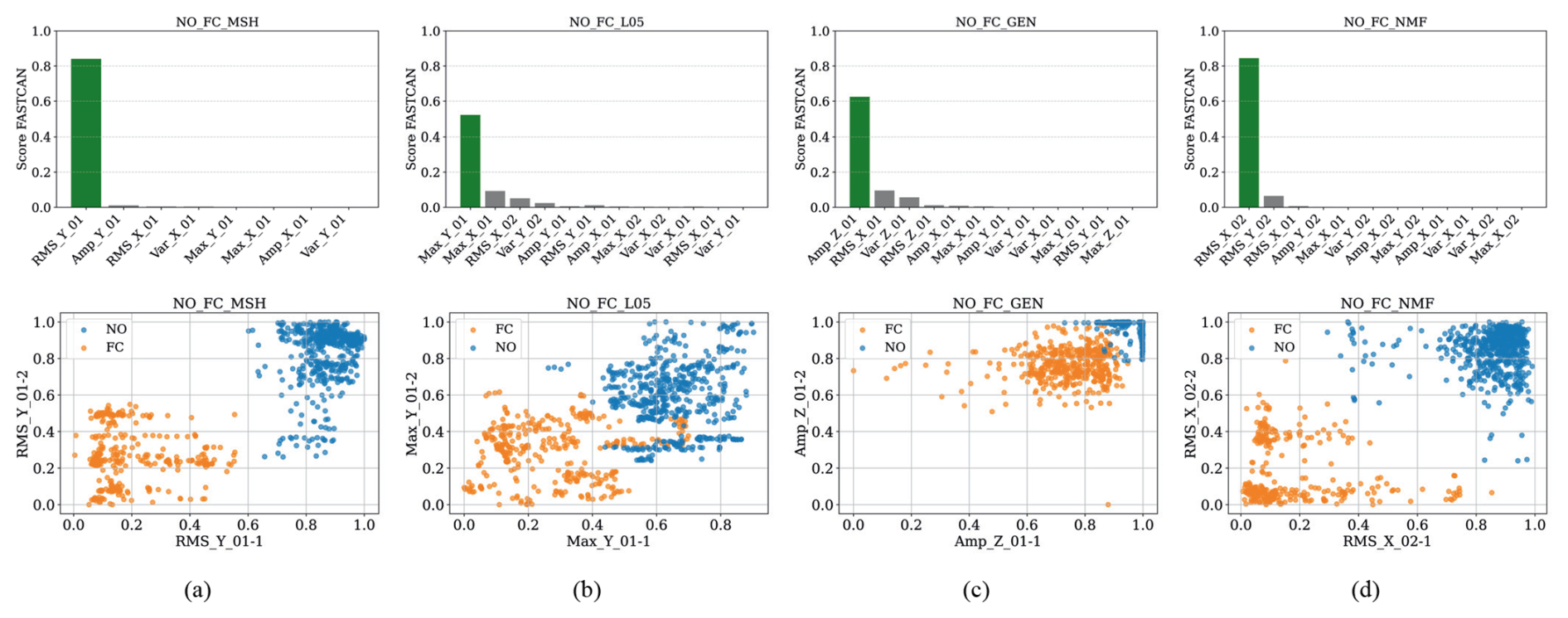 Figure 5CCA feature score and dispersion diagrams of the highest-scoring feature for the NO-FC failure: (a) sensor MSH, (b) sensor L05 (1 and 2), (c) sensor GEN, and (d) sensor NMF (1 and 2).