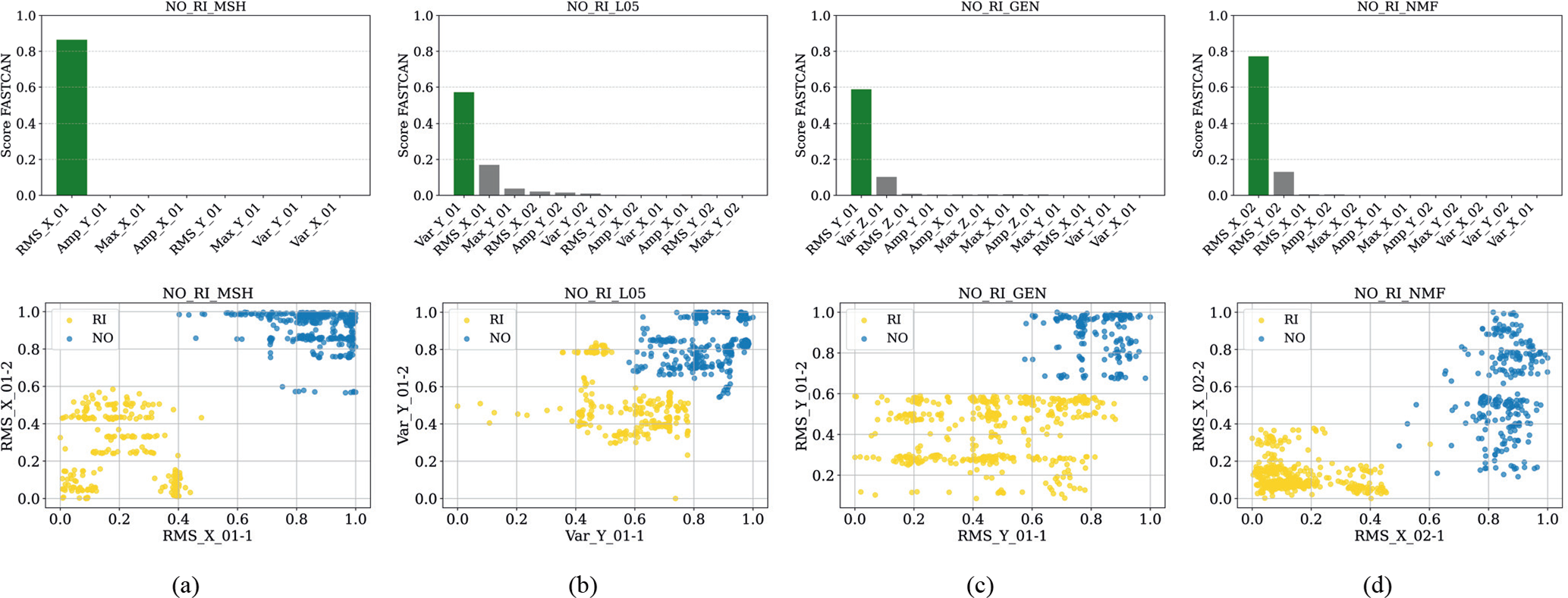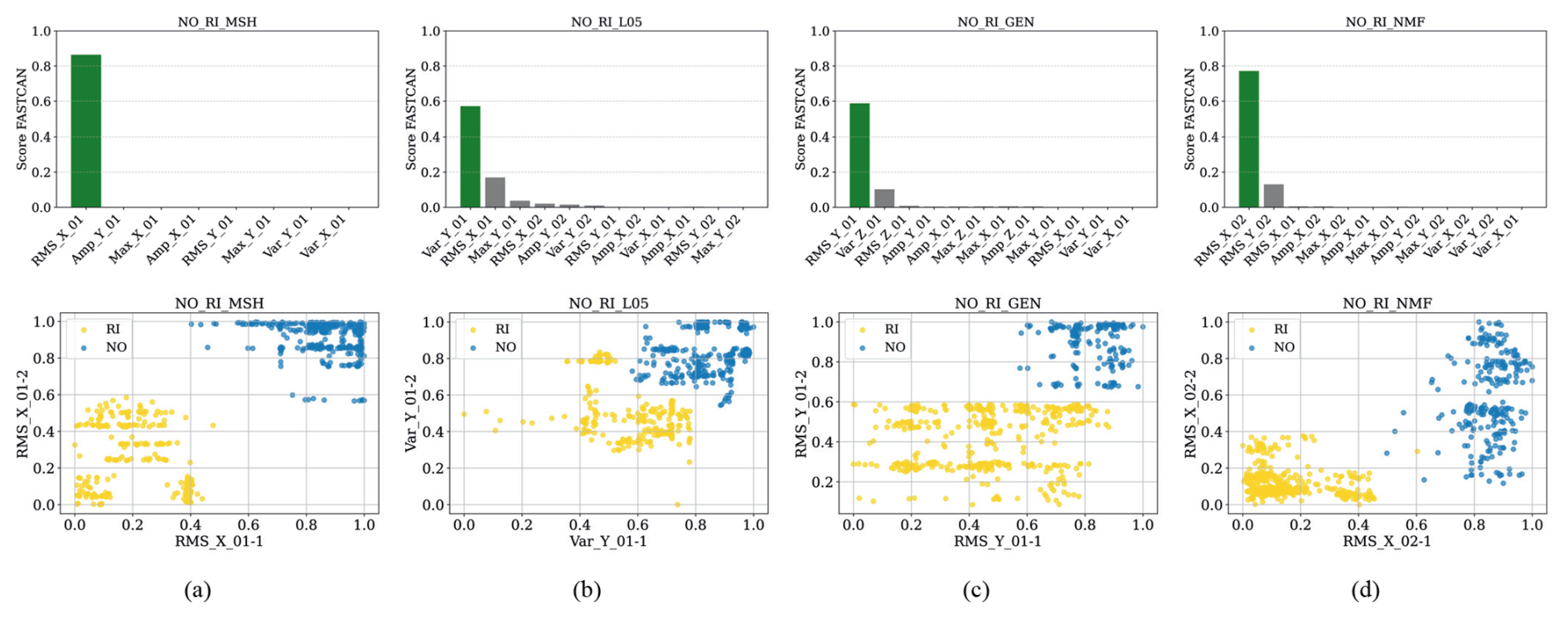 Figure 6CCA feature score and dispersion diagrams of the highest-scoring feature for the NO-RI failure: (a) sensor MSH, (b) sensor L05 (1 and 2), (c) sensor GEN, and (d) sensor NMF (1 and 2).