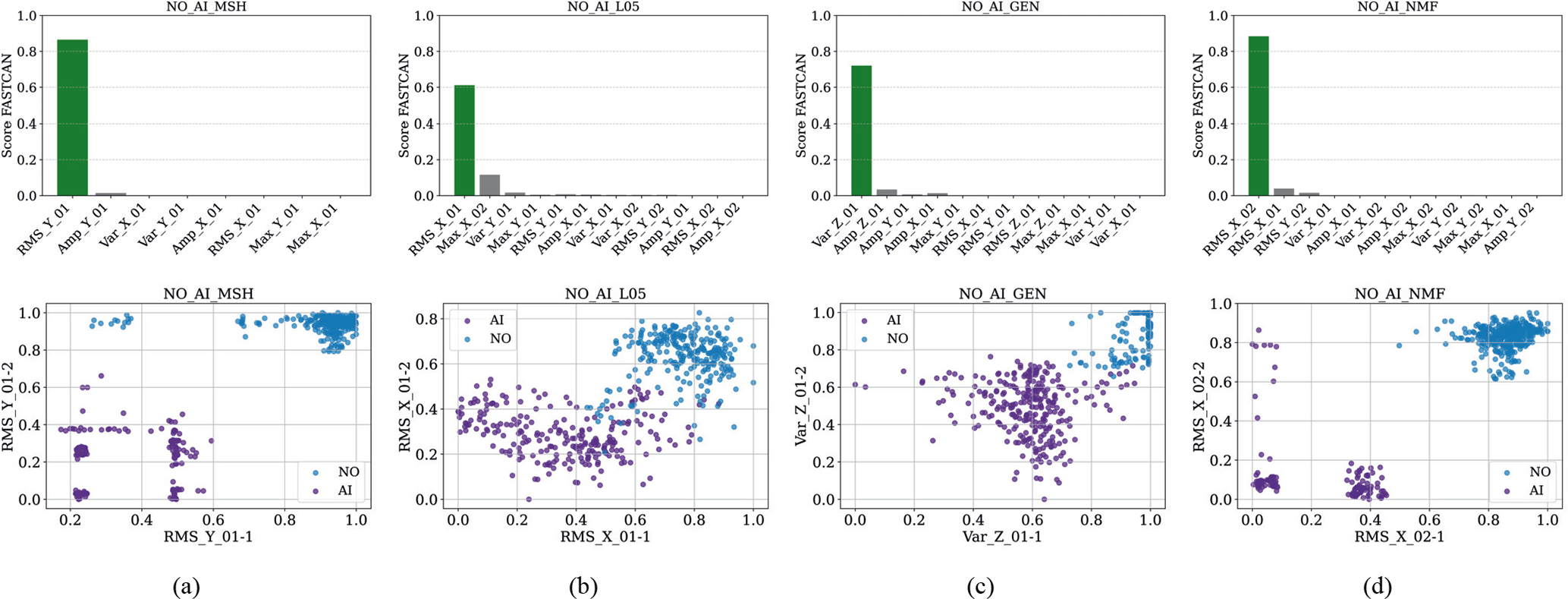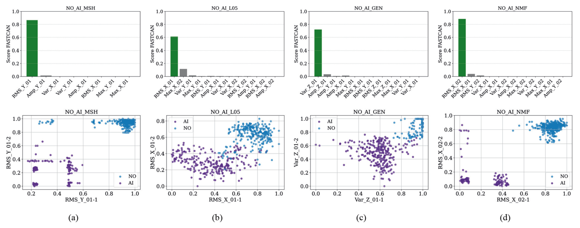 Figure 7CCA feature score and dispersion diagrams of the highest-scoring feature for the NO-AI failure: (a) sensor MSH, (b) sensor L05 (1 and 2), (c) sensor GEN, and (d) sensor NMF (1 and 2).