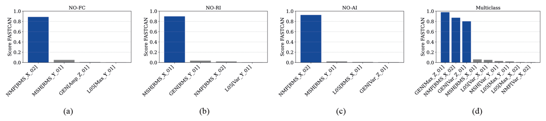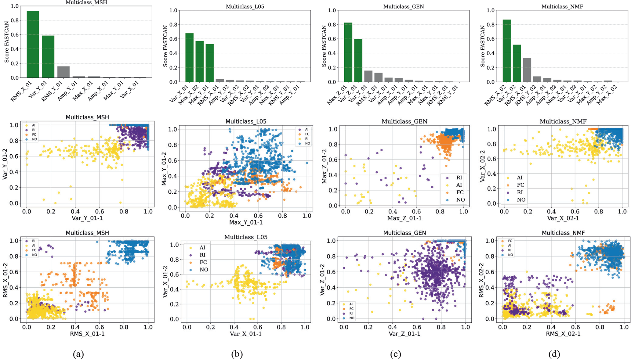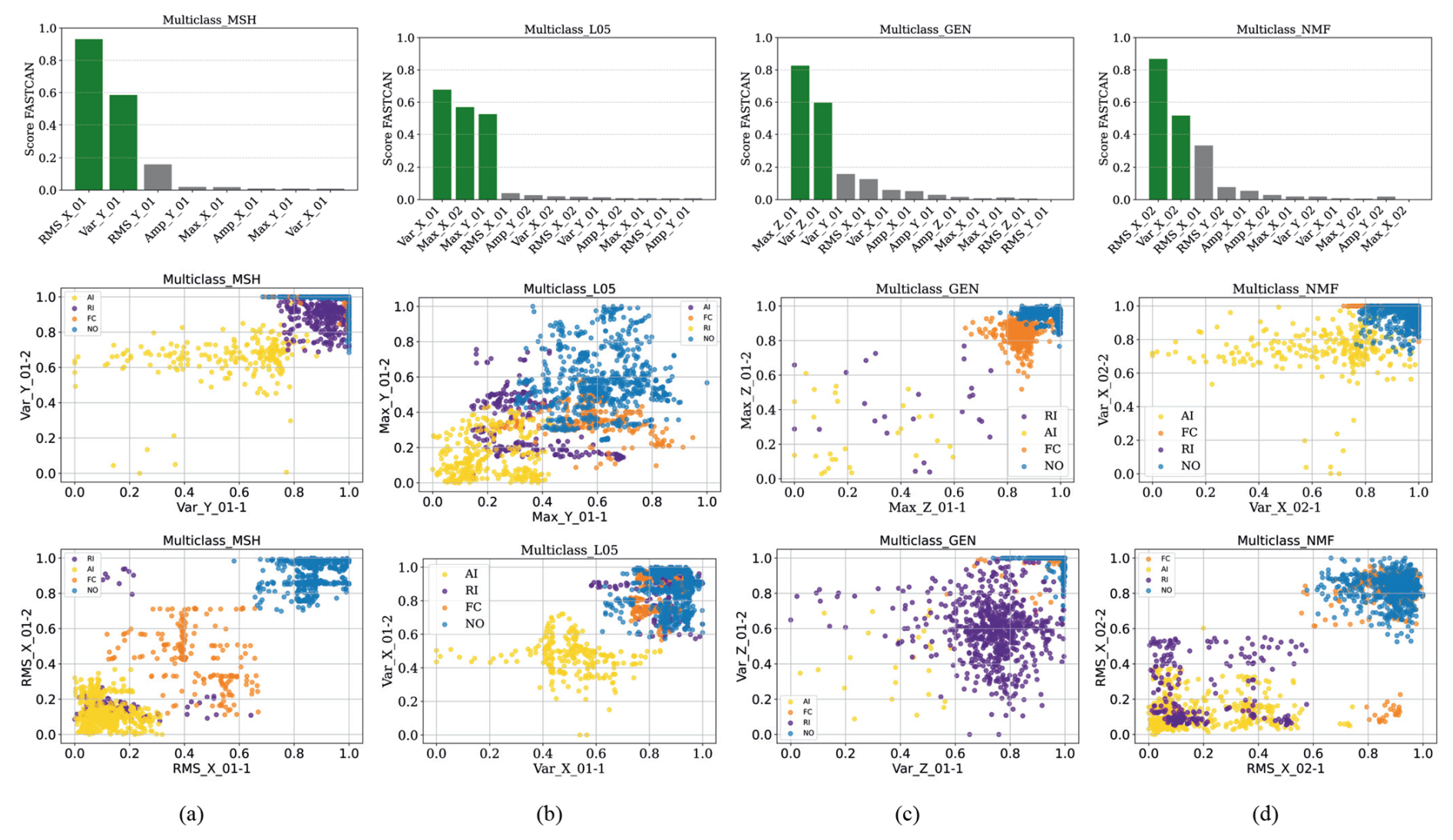 In the multi-class classification, the k-means algorithm identifies four clusters corresponding to NO, FC, RI, and AI conditions, organizing the dataset accordingly into response clusters. These clusters support further validation of classification through performance metrics. Figure 9 displays the highest-scoring features of each sensor and their related dispersion diagrams, labelled by k-means and ranked by Algorithm 2, respectively. Each class is colour-coded to facilitate quick visual identification and analysis of overlaps between operational states.