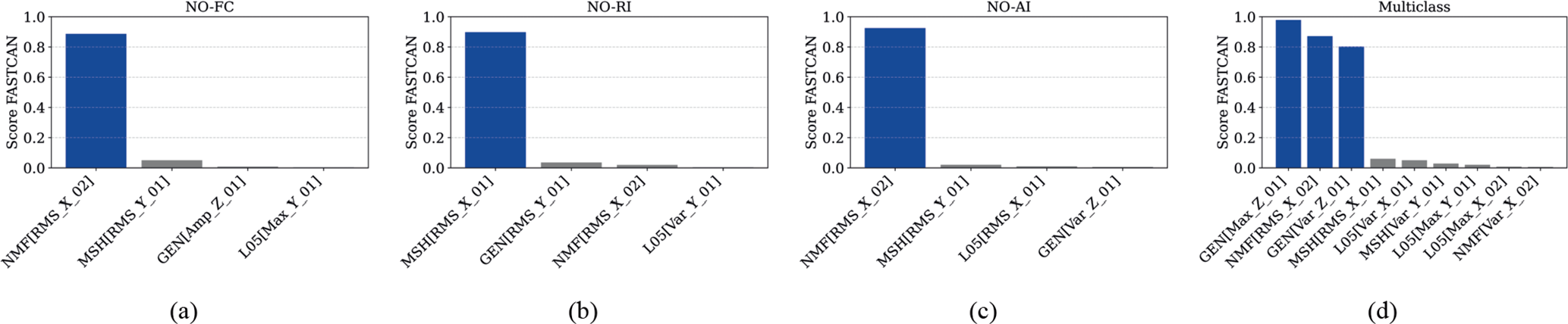 Figure 11Feature score of the Fe-Sc-kms dataset for (a) NO-FC, (b) NO-RI, (c) NO-AI, and (d) multi-class.